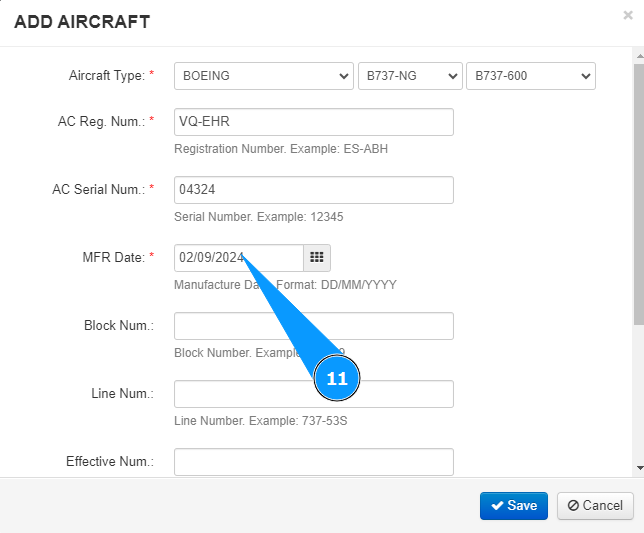 11. Enter the aircraft manufacture date in the field "MFR Date".