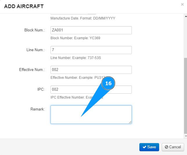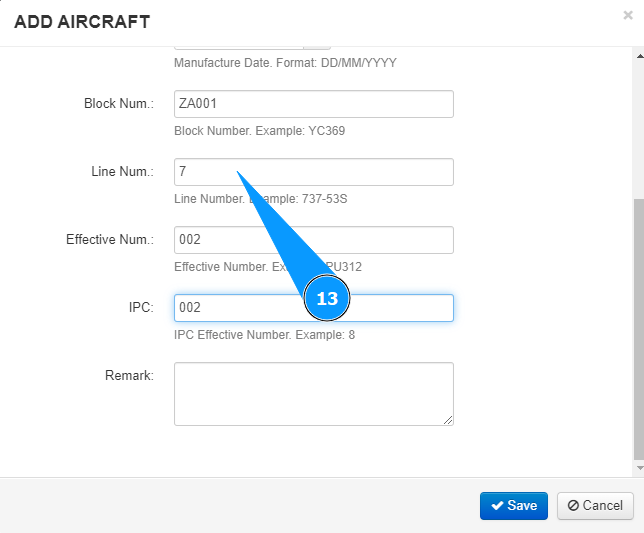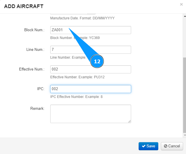12. If necessary, enter the aircraft block number in the field "Block Num.".