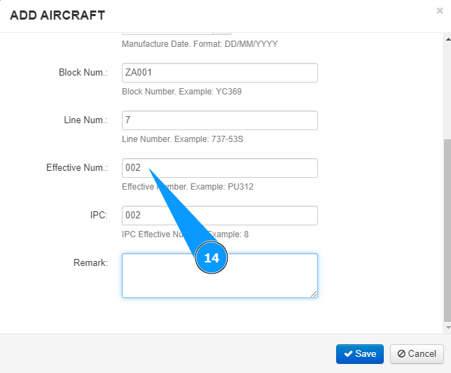 14. If necessary, enter the aircraft effectivity in the field "Effective Num.".
