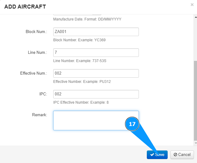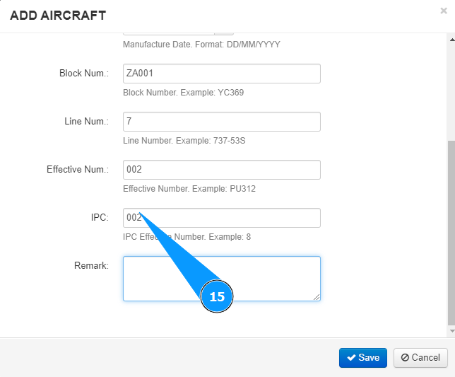 15. If necessary, enter the aircraft number in catalog of IPC in the field "IPC".