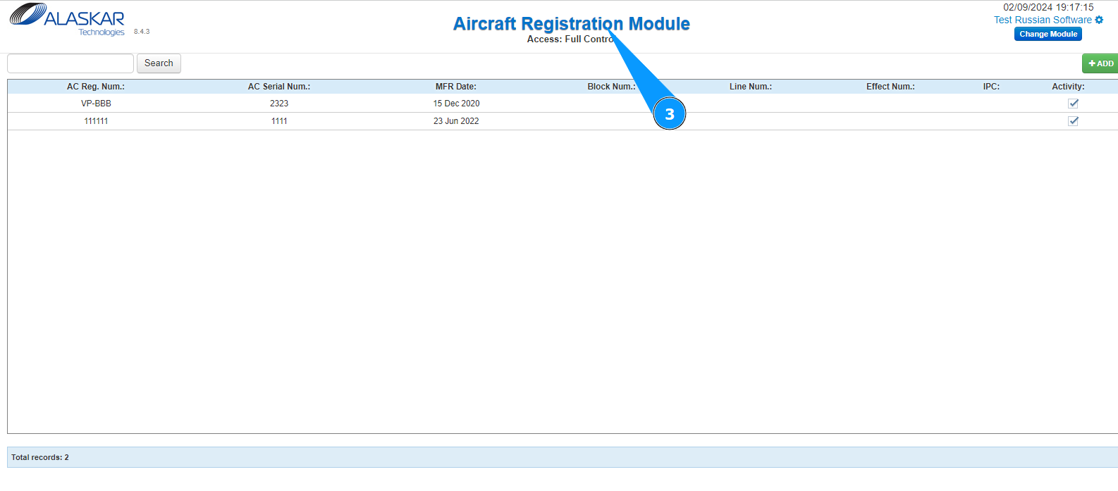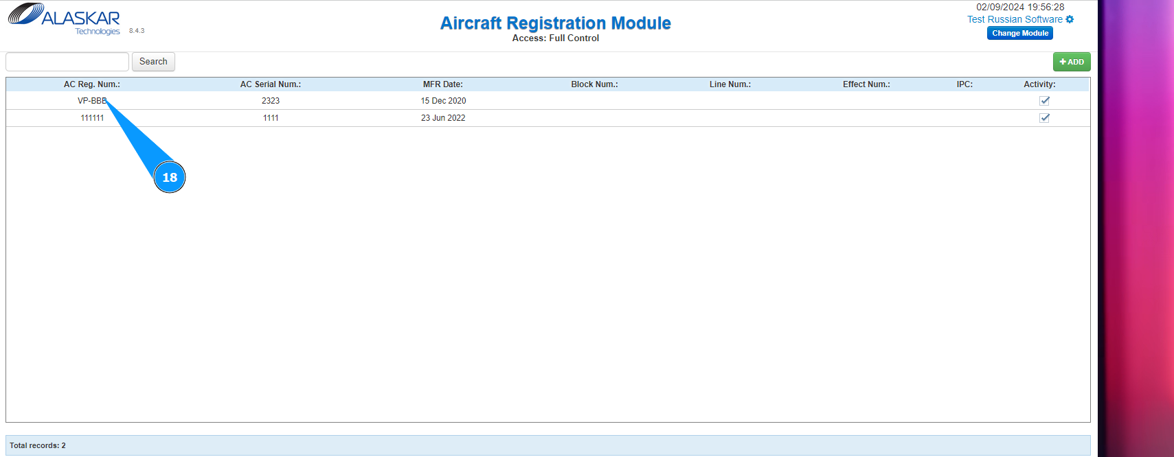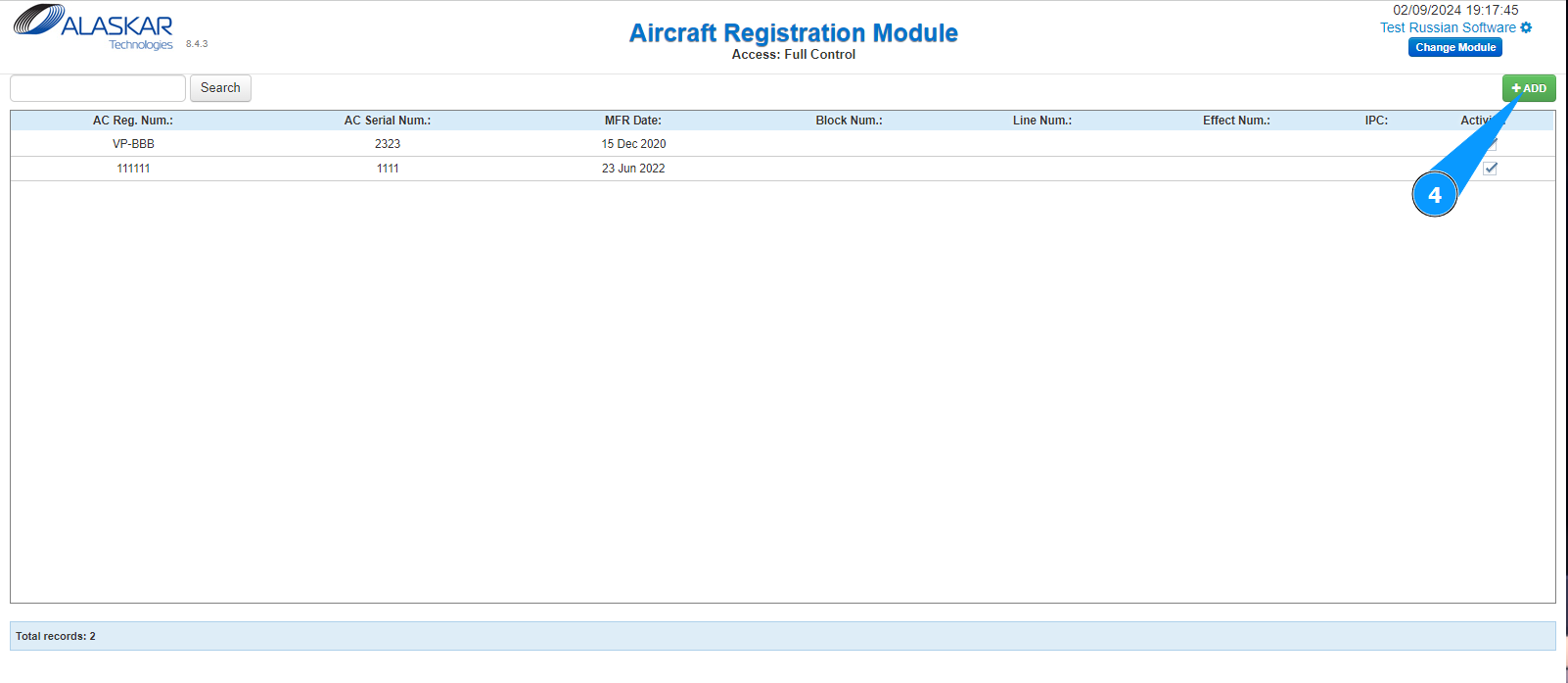 18. Check that the newly created aircraft is displayed in the window "Aircraft Registration Module".