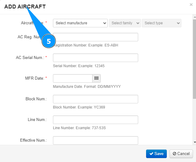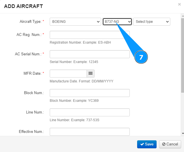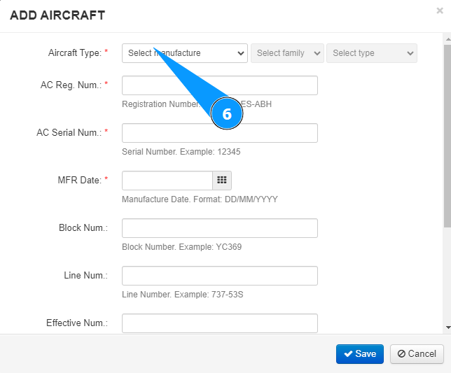 7. Select the aircraft family from the dropdown list in the field "Aircraft Family".