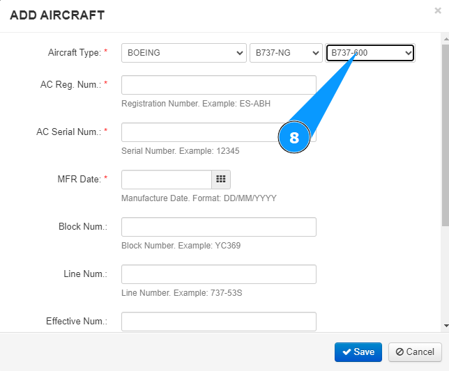 8. Select the aircraft type from the dropdown list in the field "Aircraft Type".