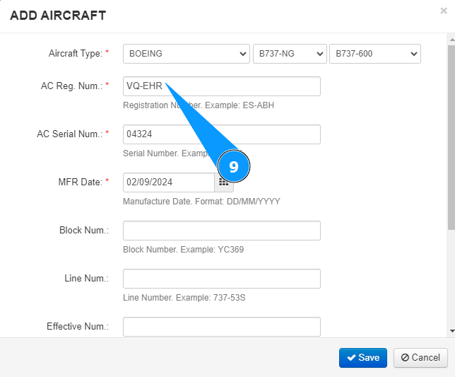 9. Enter the aircraft registration in the field "Aircraft Reg. Num".