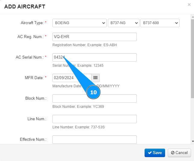 10. Enter the aircraft serial number in the field "Aircraft Serial Num".