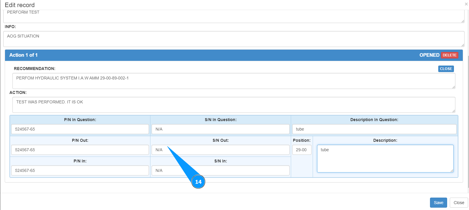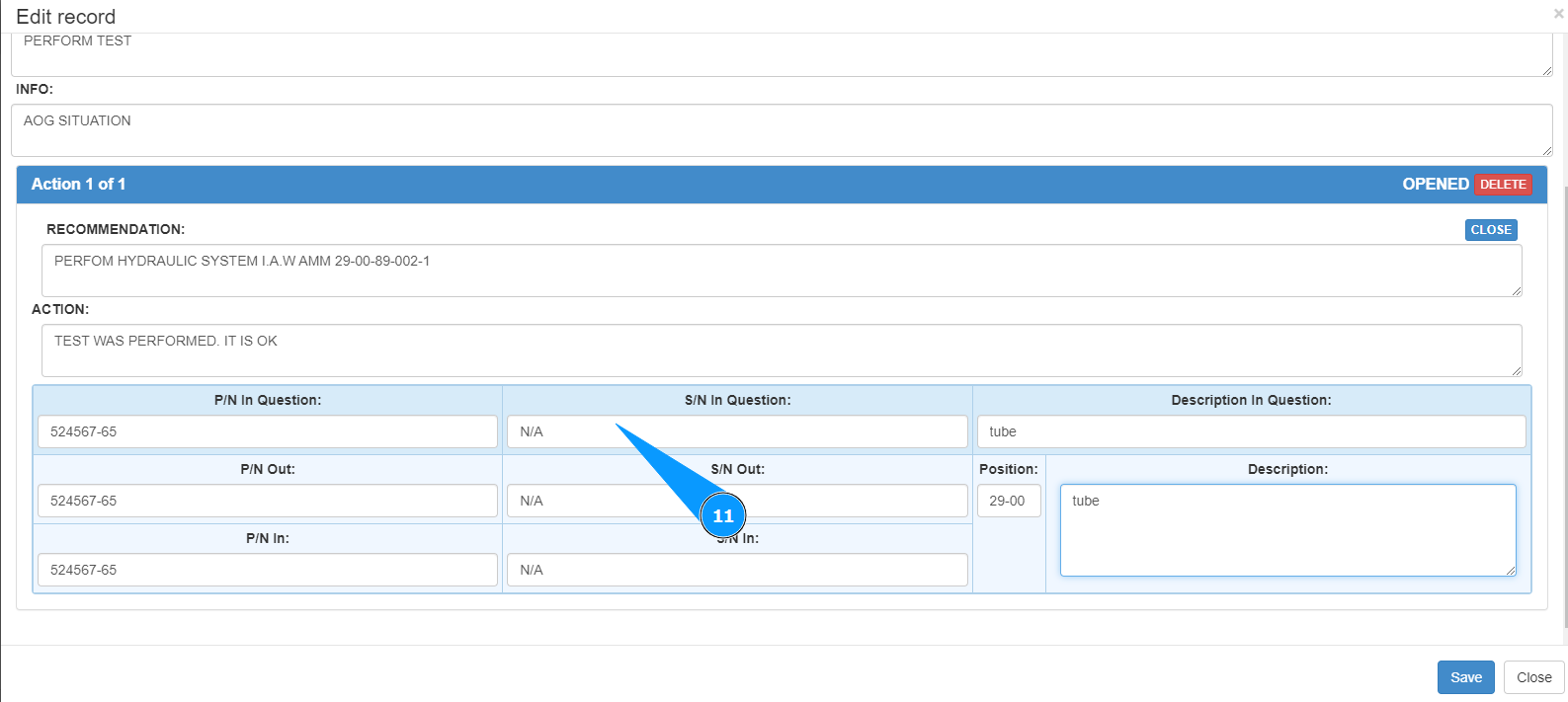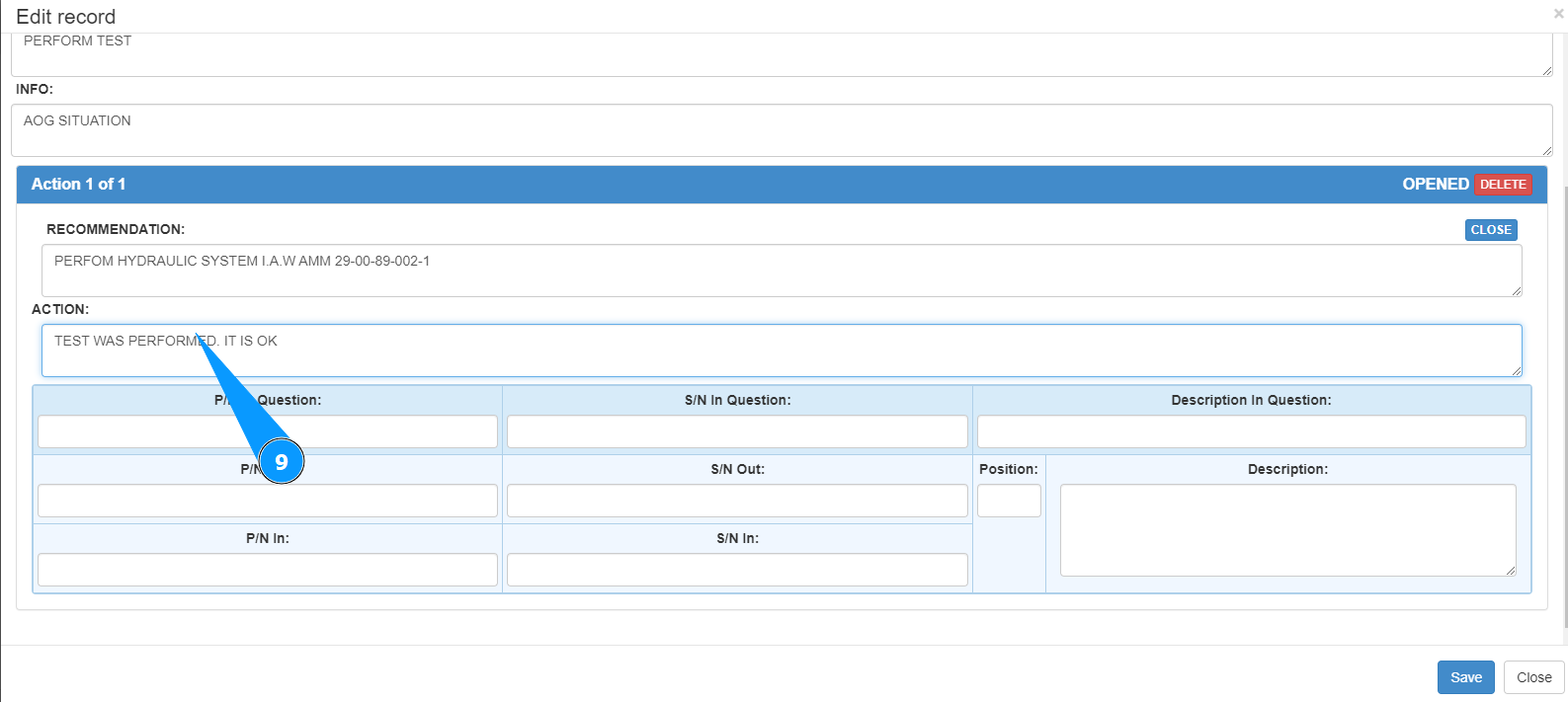 19. If the work has not actually been completed, click on the button "Save" to save the entered action data to the troubleshooting card.