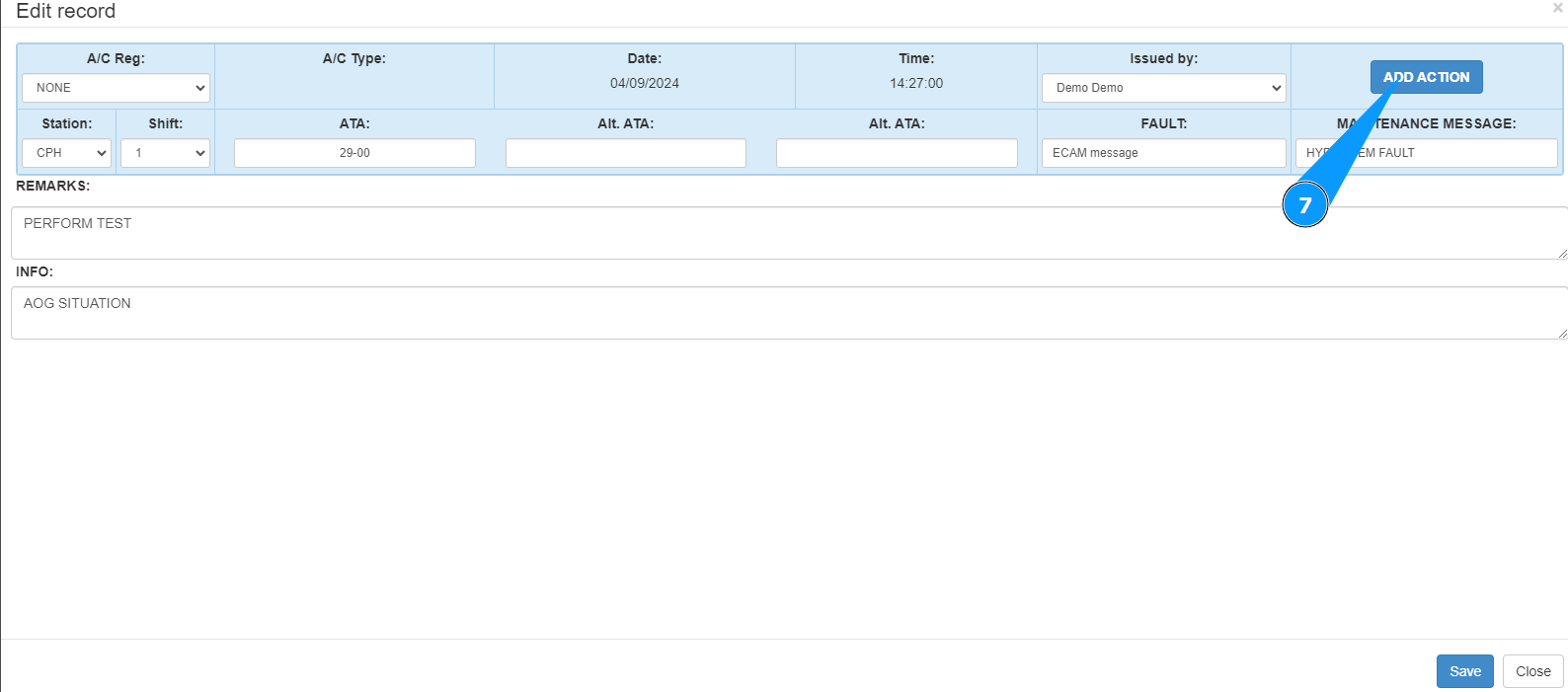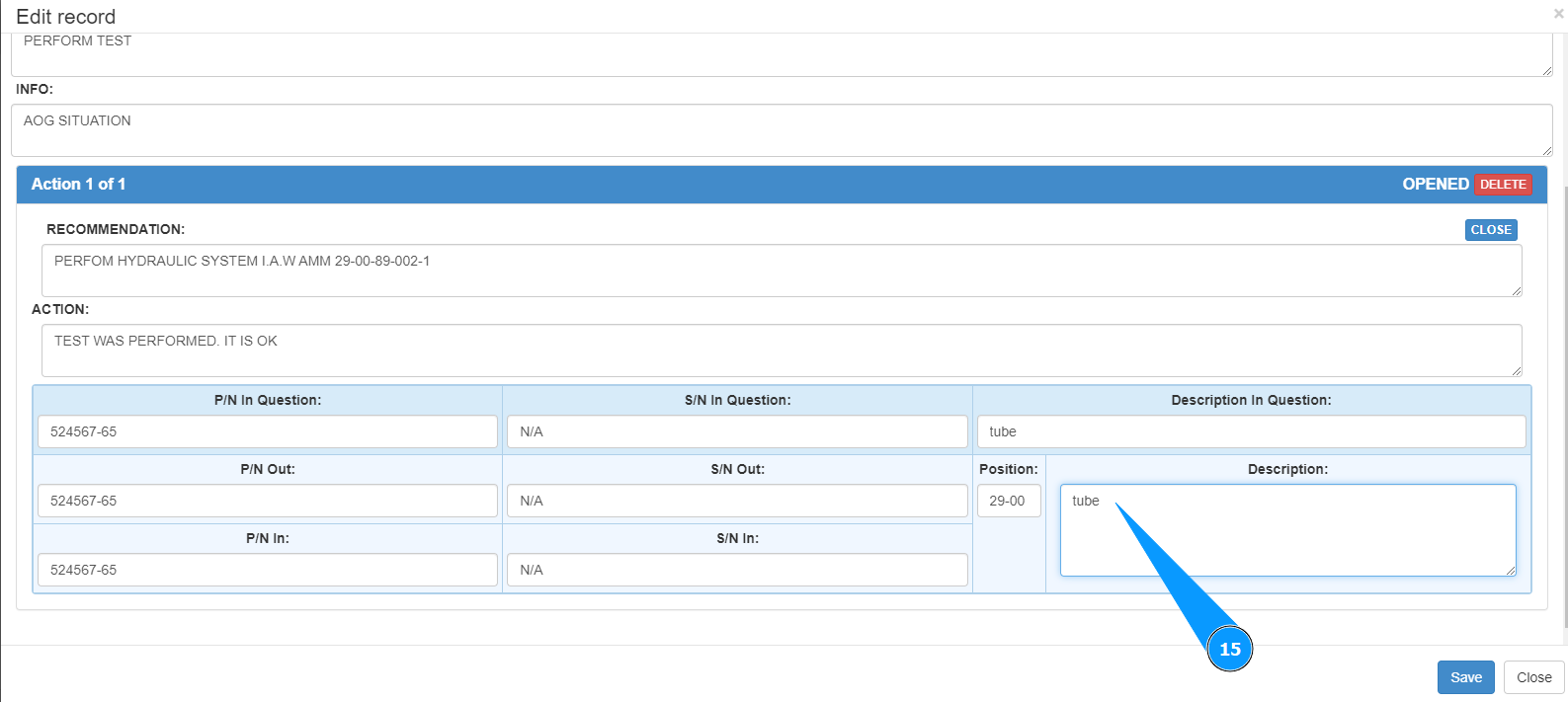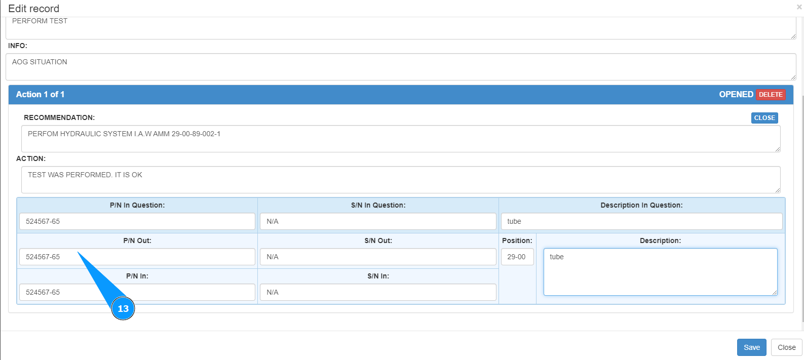 19. If the work has not actually been completed, click on the button "Save" to save the entered action data to the troubleshooting card.