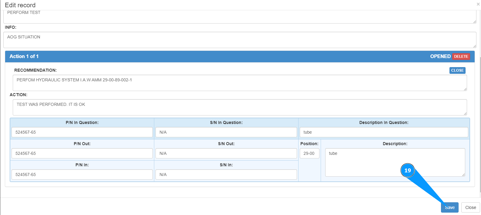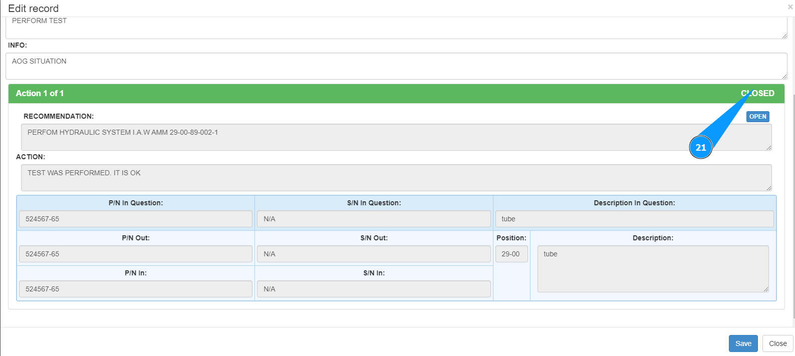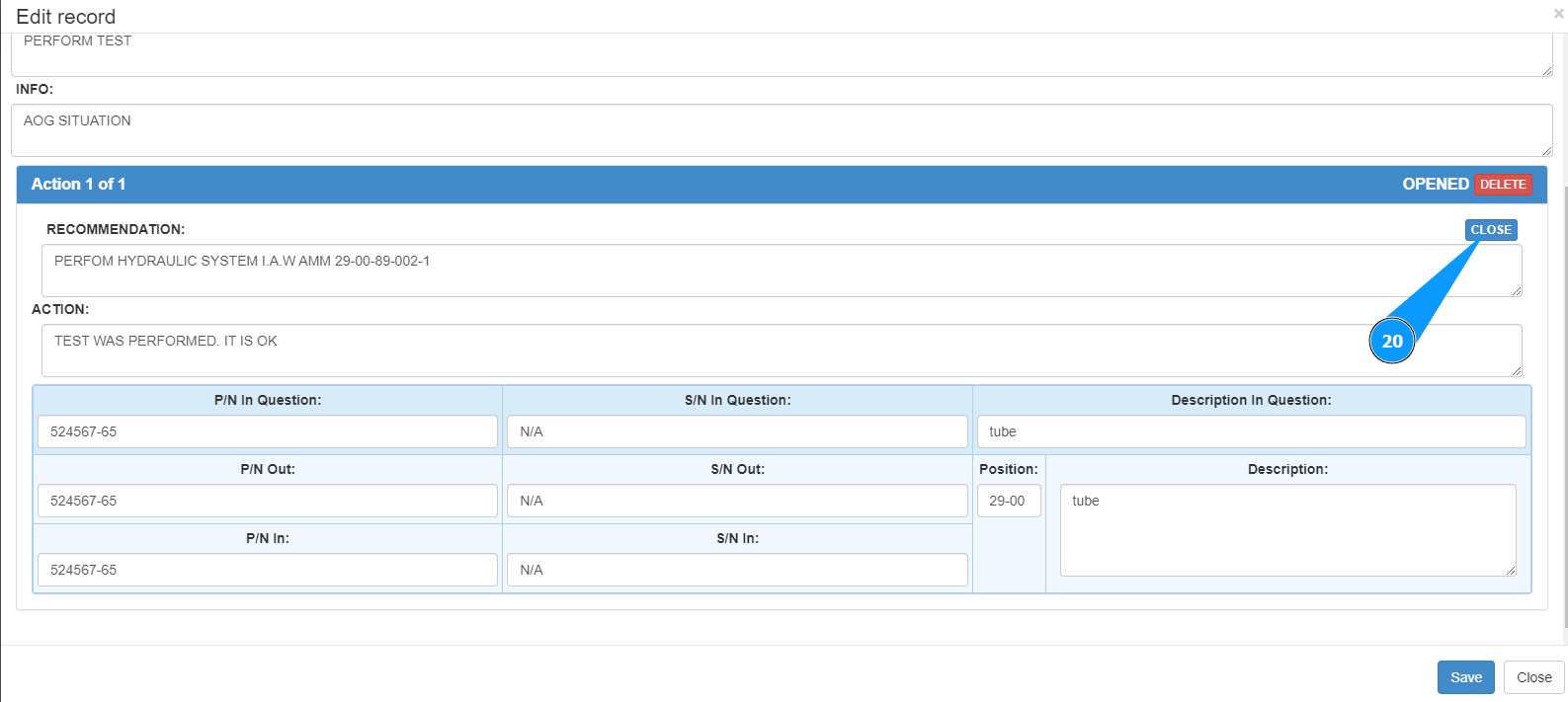 20. If the work has actually been fully completed for this action step, click on the button "Close" to close this step in the troubleshooting card.