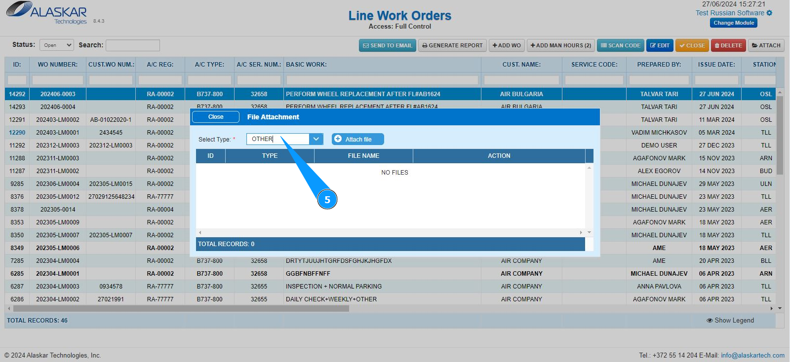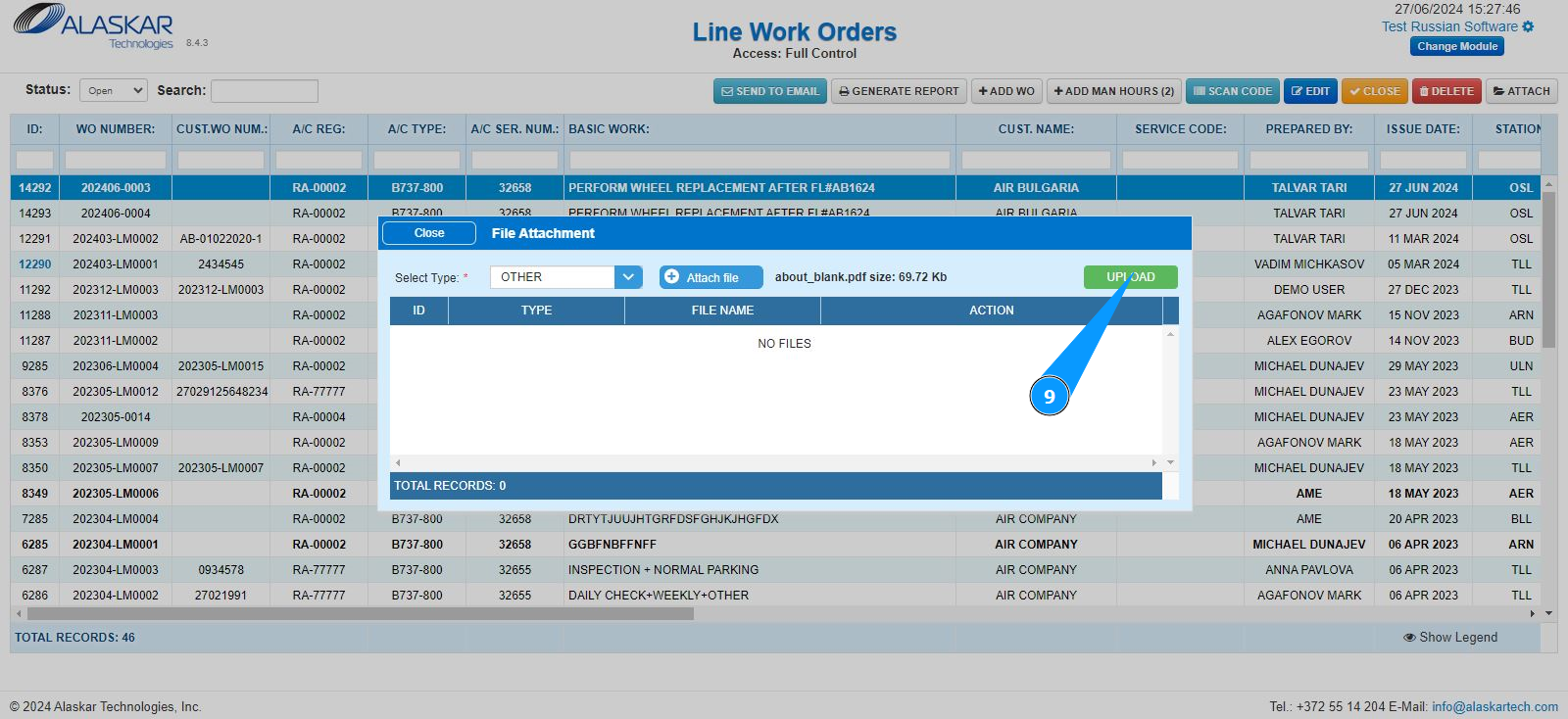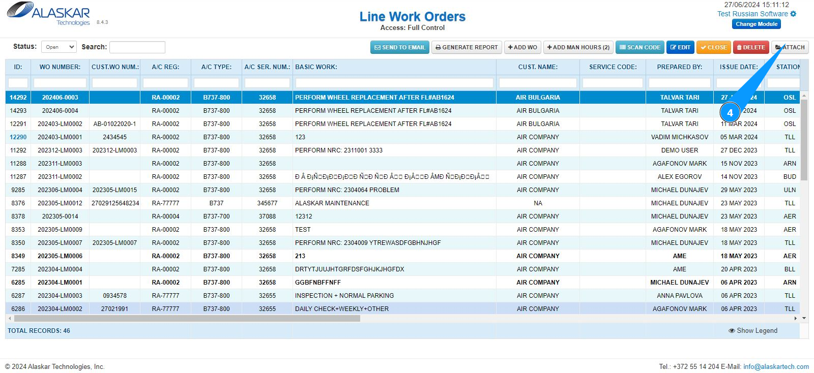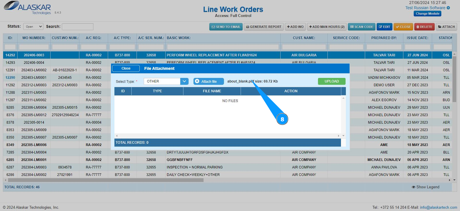 3. Select the required LWO line from the list to attach the document. Click on a line to highlight it. Note: If necessary, use the available search filters: "ID", "WO Number" and so on.