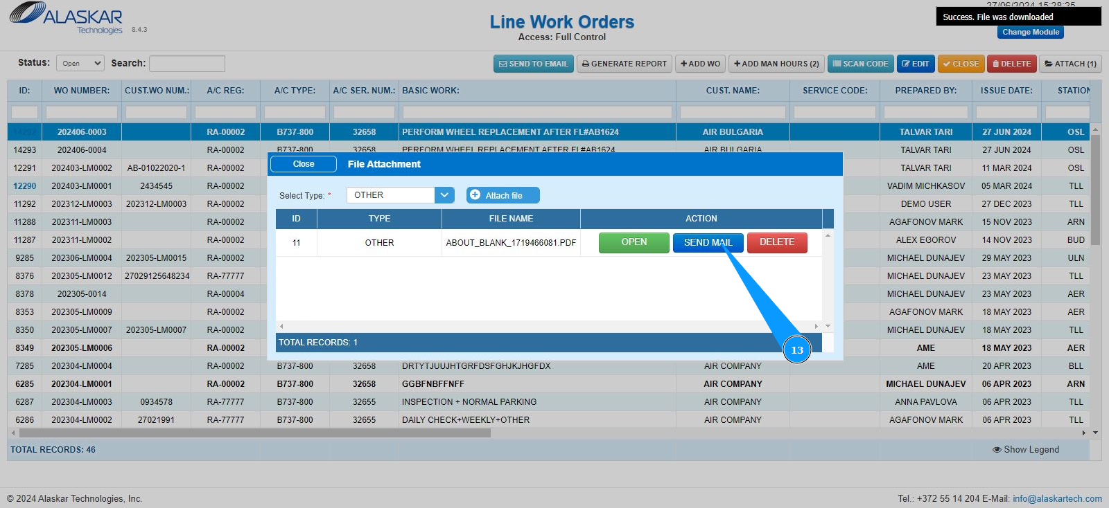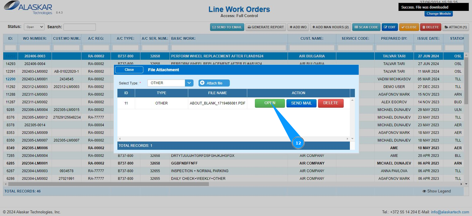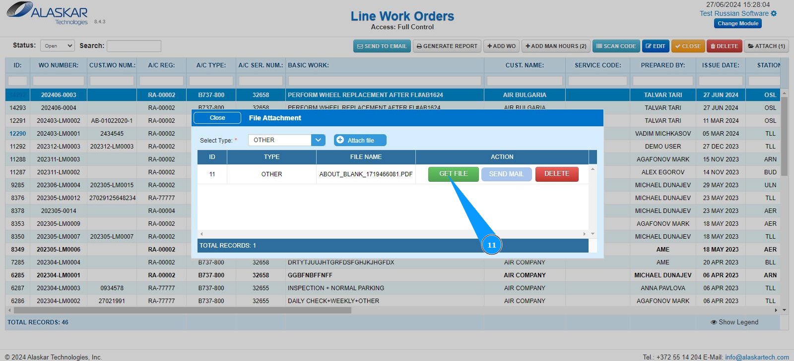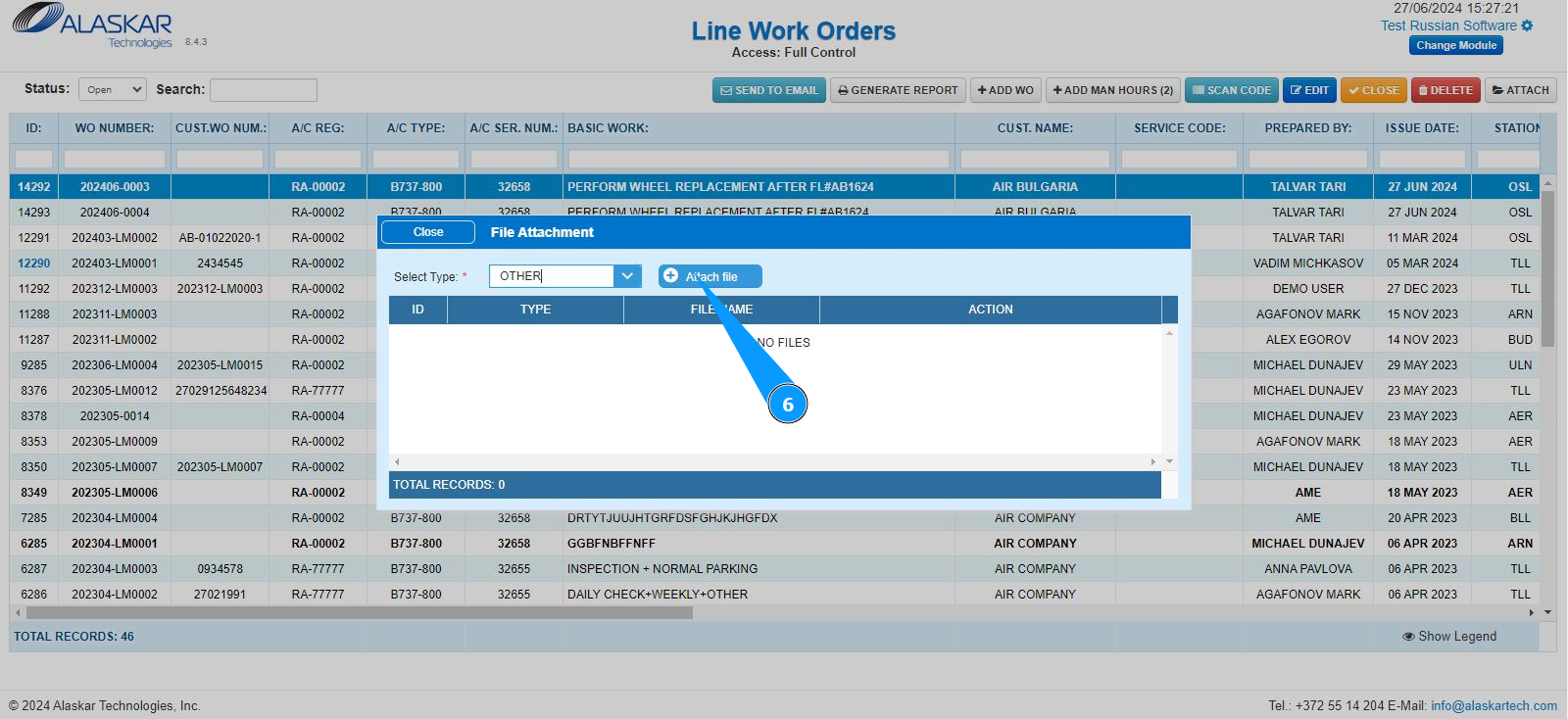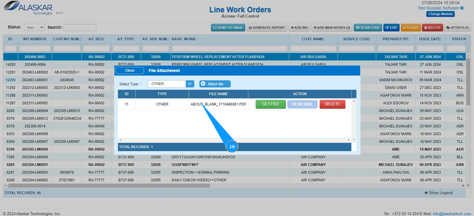 3. Select the required LWO line from the list to attach the document. Click on a line to highlight it. Note: If necessary, use the available search filters: "ID", "WO Number" and so on.