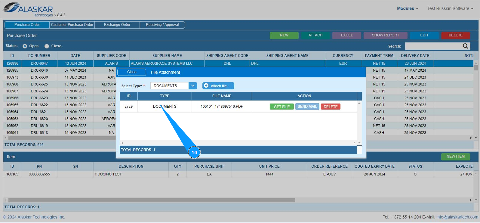 Note: It is also possible to delete the attached file if necessary. Select the line with the file and click on the button "Delete".