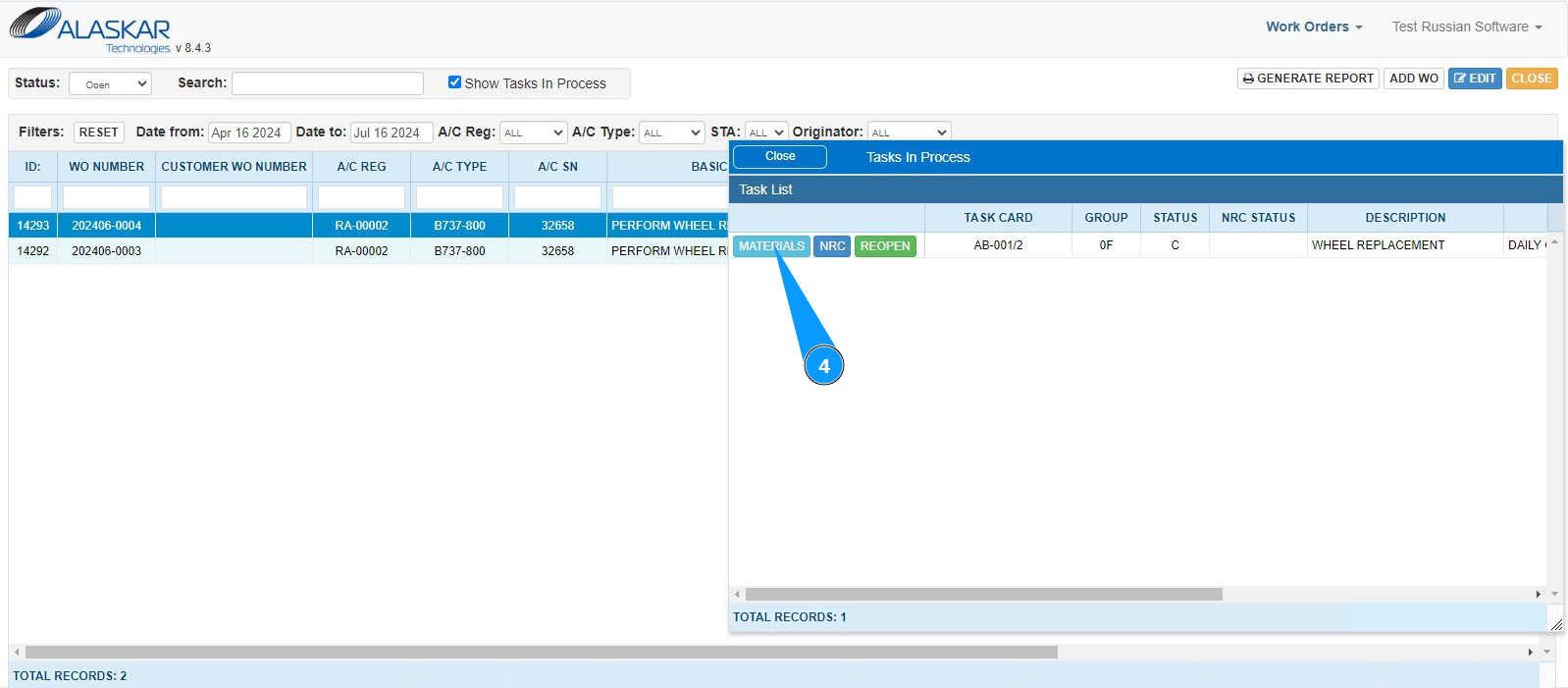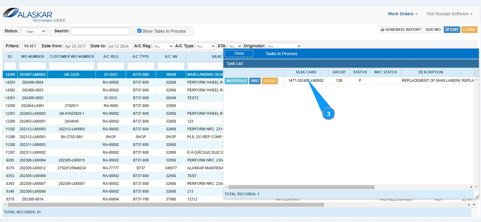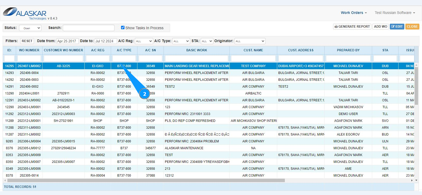 2. Select the required work order and click on the corresponding line. Note: If necessary, use the available filters in the fields: "A/C Reg.", "A/C Type", "STA" and so on.