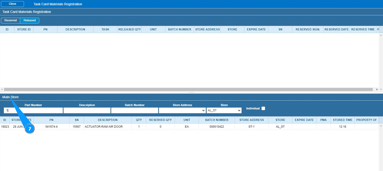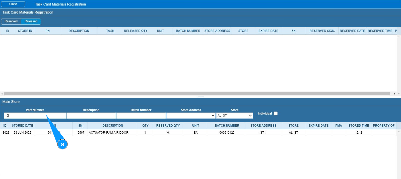 8. To search for the required materials and components in the store, use the available filters in the fields: "Part Number", "Description", "Store Address" and so on.