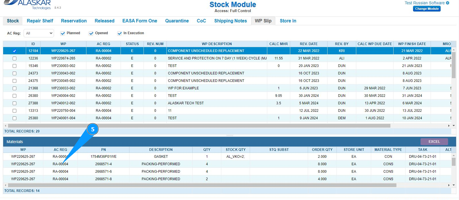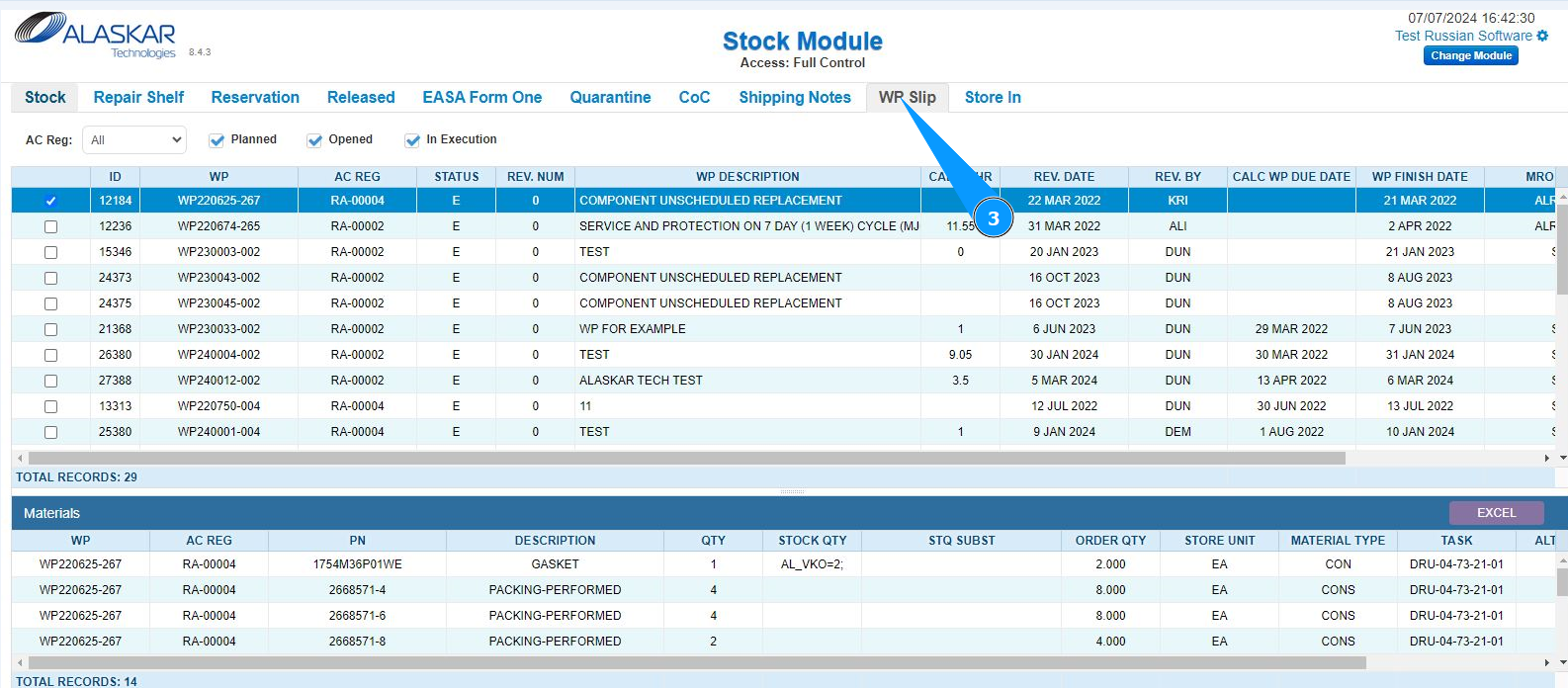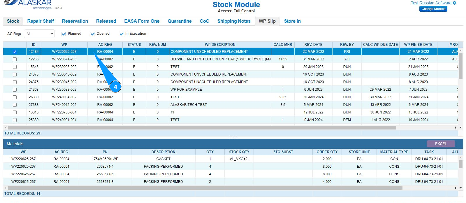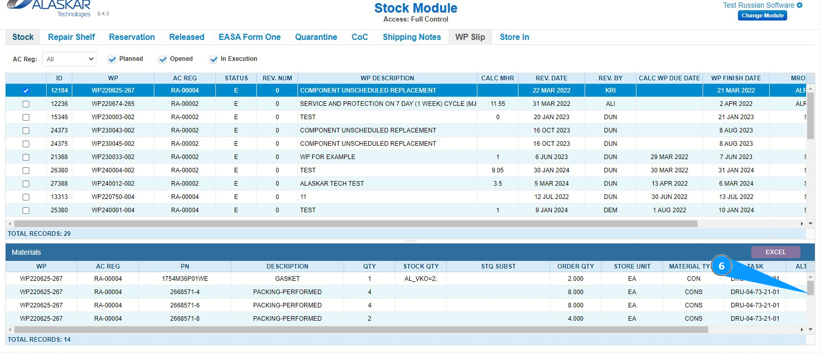 Note: Filling tasks with materials is done in the module "Part M". The tab "WP slip" is for checking only.