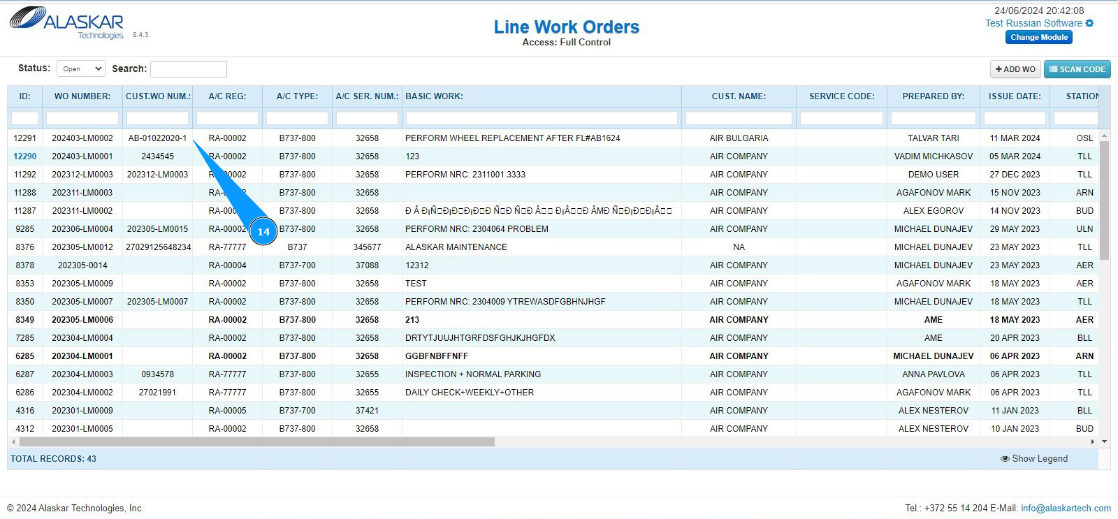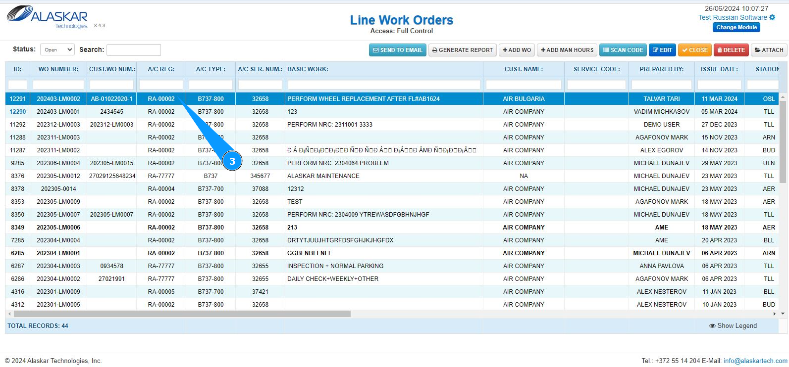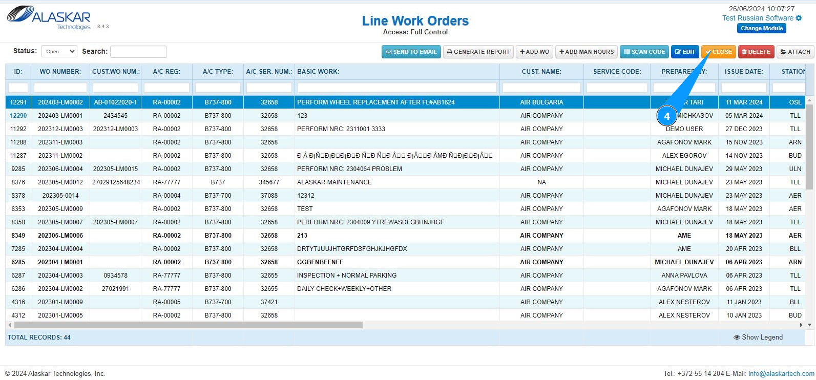 3. Select the required line with LWO to close the list. Click on a corresponding line to highlight it. Note: If necessary, use the available search filters: "ID", "WO Number" and so on.