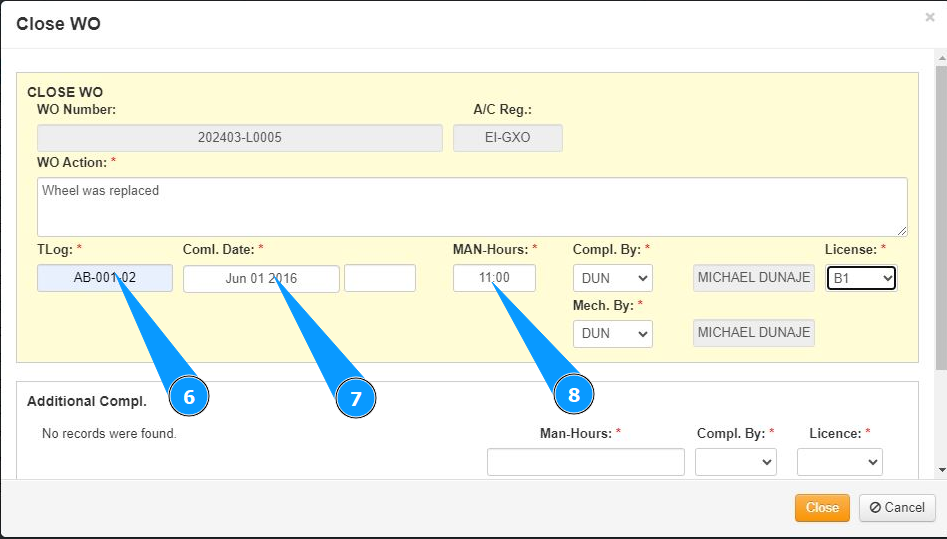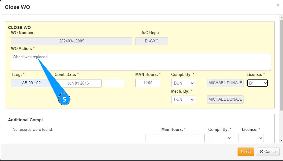 7. Enter the WO closing date in the field "Compl. Date" or select from the calendar.