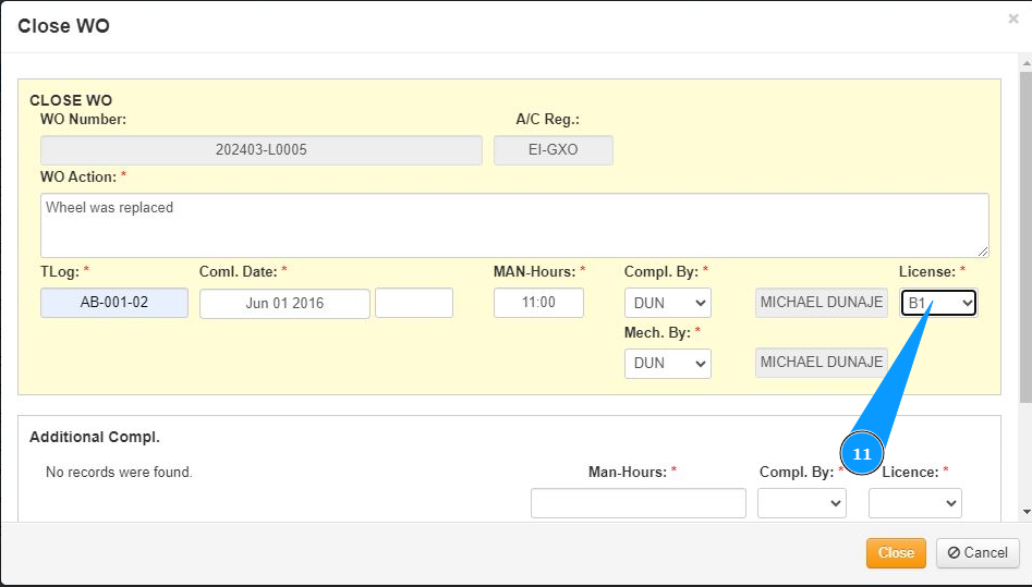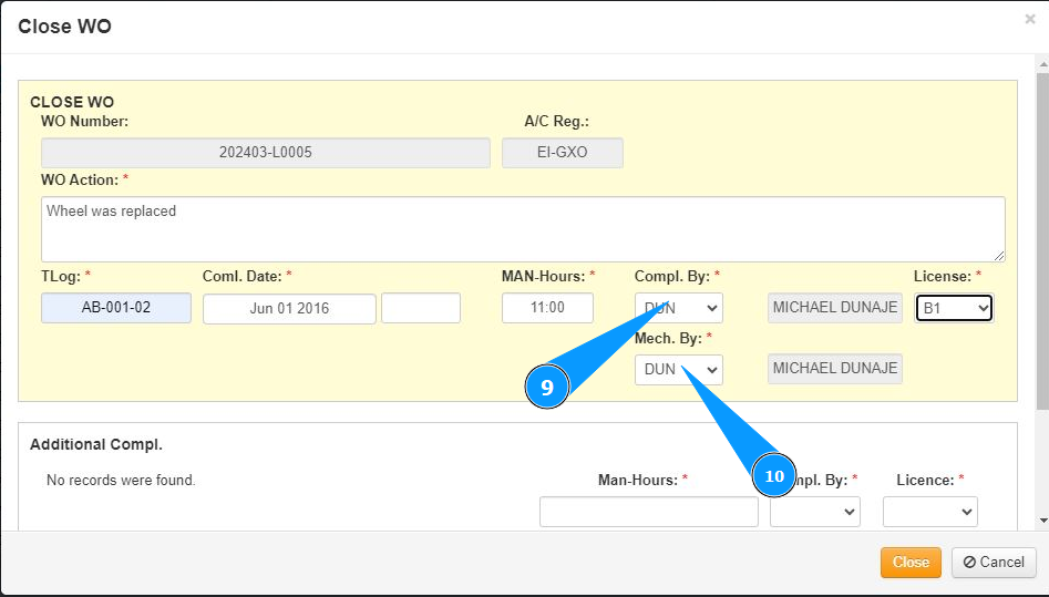 9. Select from the dropdown list the initials of who closed the LWO (in accordance with your company's policy) in the field "Compl.by"