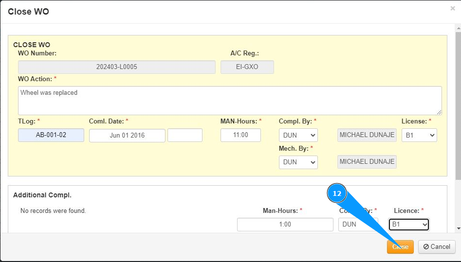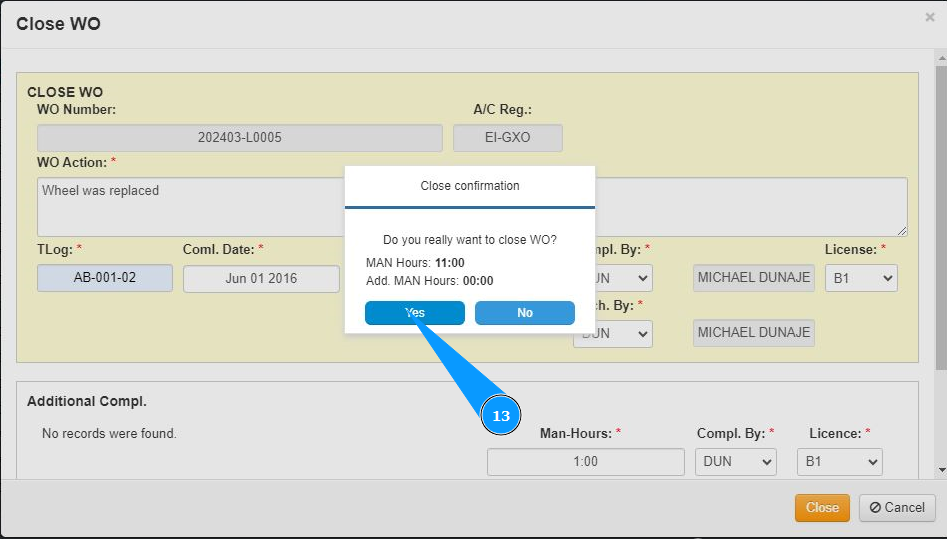 12. Click on the button "Close", the WO closing process is completed; you need to write the entered data into the program.