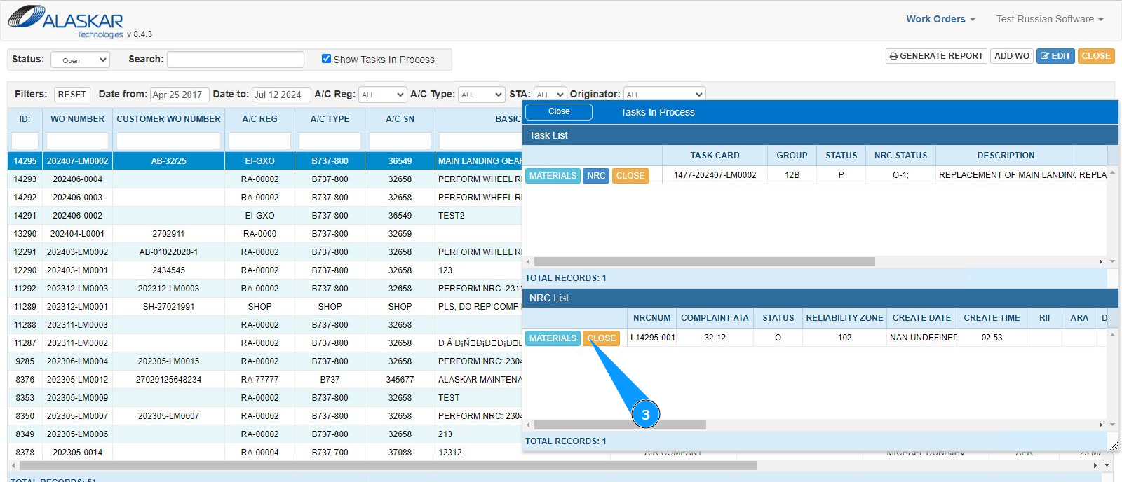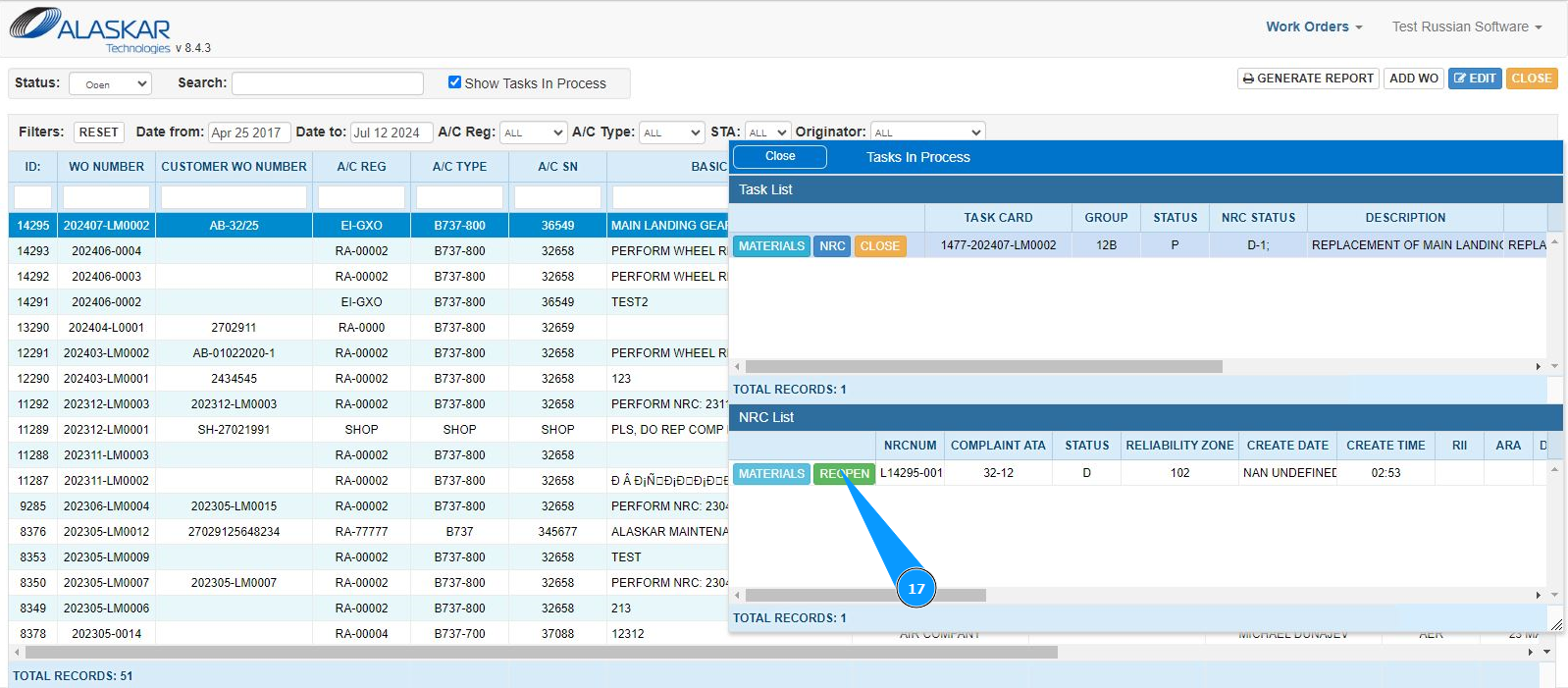 2. Select the required work order and click on the corresponding line. Note: If necessary, use the available filters in the fields: "A/C Reg.", "A/C Type", "STA" and so on.