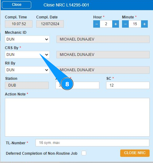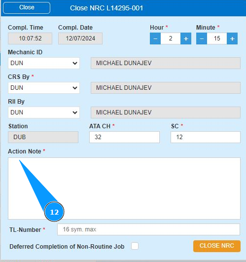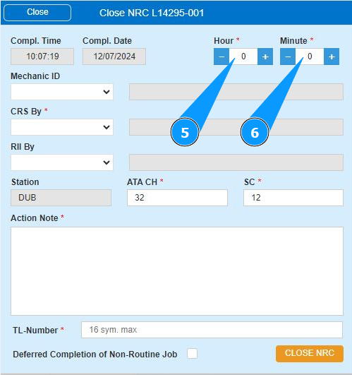 5. Enter the quantity of man-hours spent in hours in the field "Hour". Note: The NRC closing time in the field "Compl.Time" and the closing date in the field "Compl.Date" are generated automatically by the program.