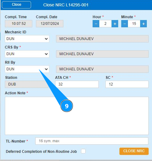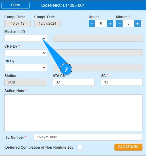 7. Enter the login of the NRC performer (in accordance with your company policy) in the field "Mechanic ID" or select from the dropdown list. Note: The last and first names of the personnel are displayed by the program automatically.