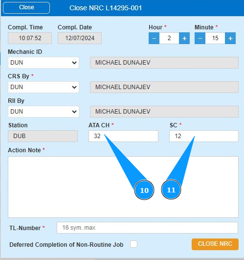 10. Enter the ATA section number in the field "ATA Ch". Note: The station of NRC performance is displayed by the program automatically.