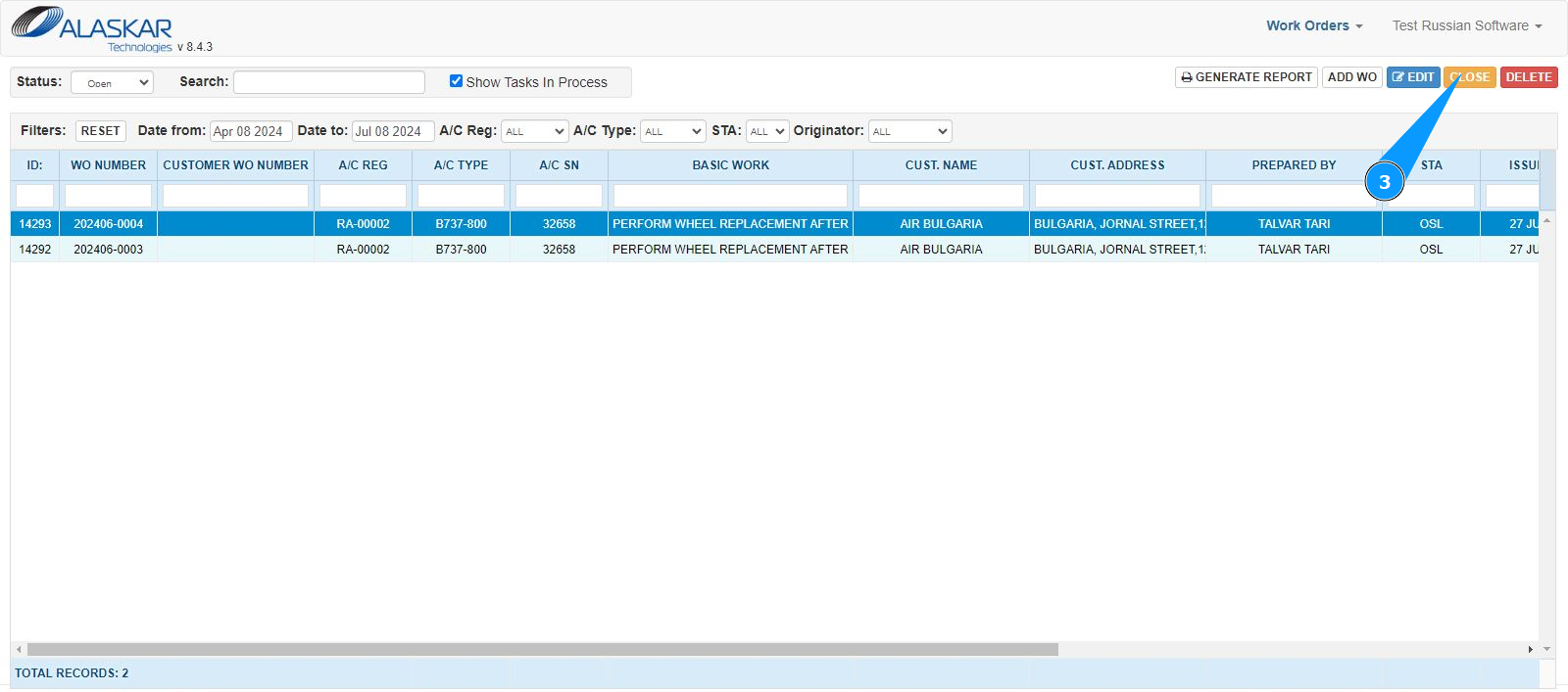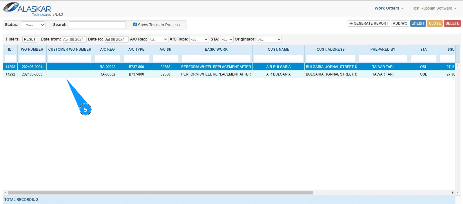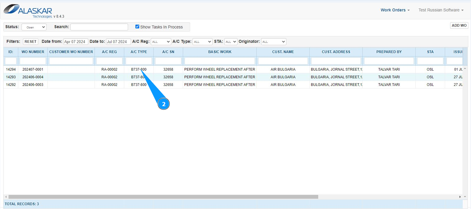 2. Select the required Work Order and click on the corresponding line. Note: If necessary, use the available filters in the fields: "A/C Reg.", "A/C Type", "STA" and so on.