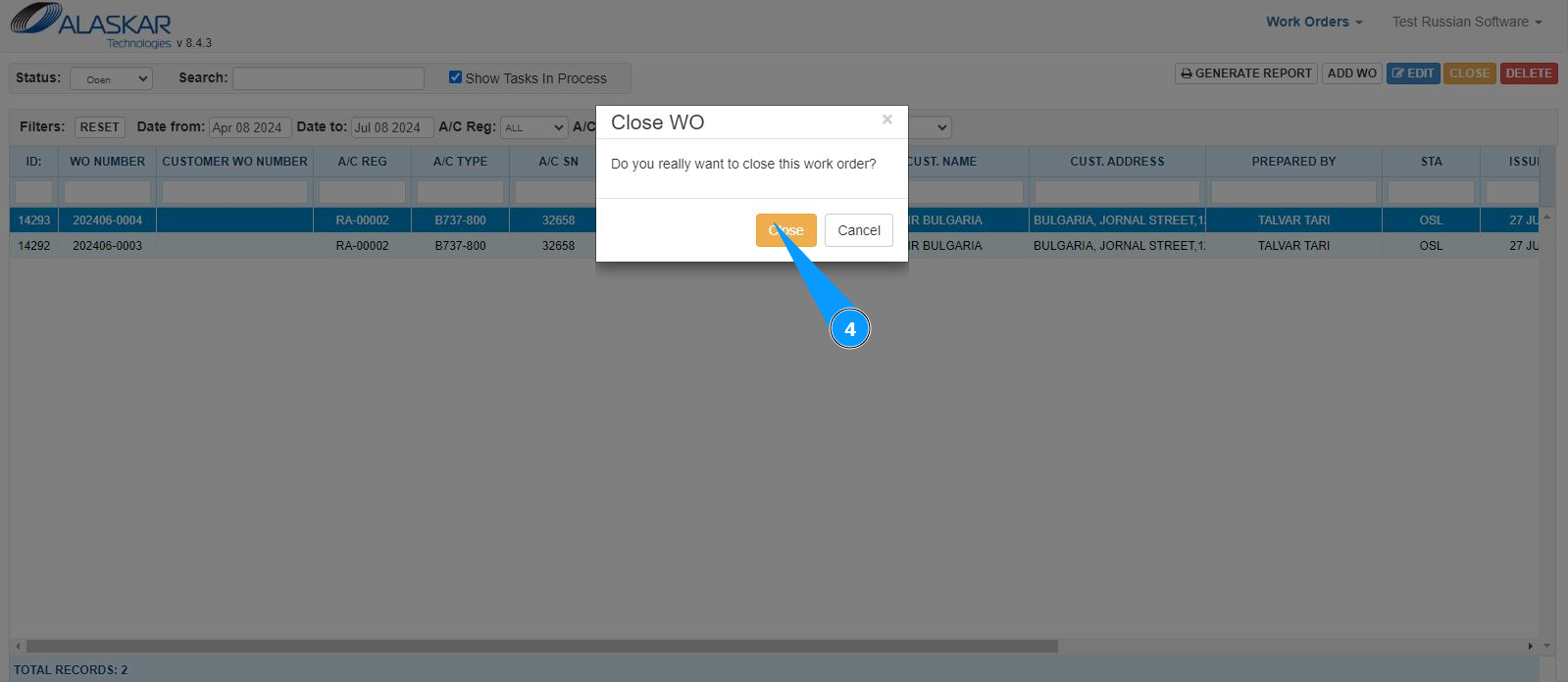 4. Click on the button "Close" to save the entered WO closing to the program.