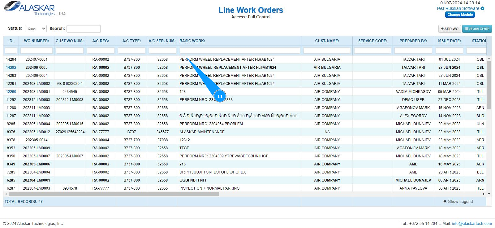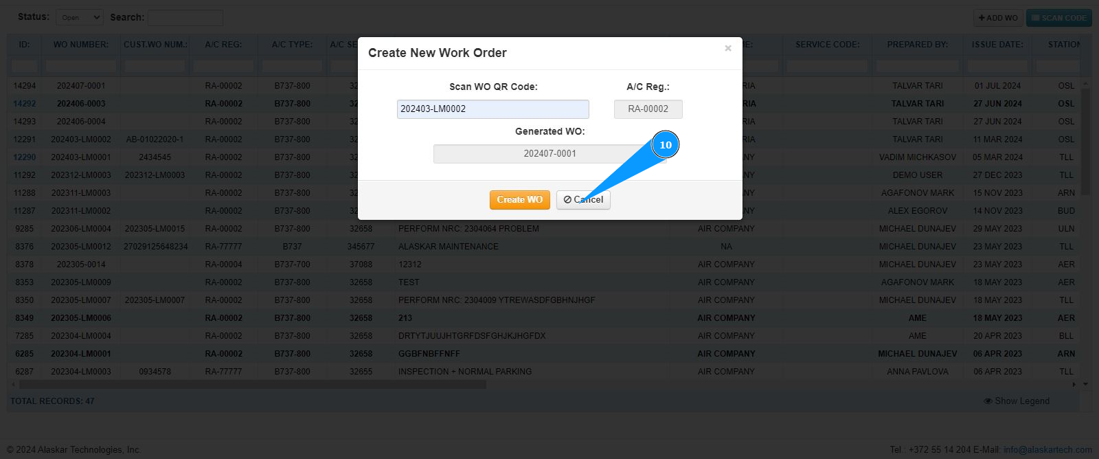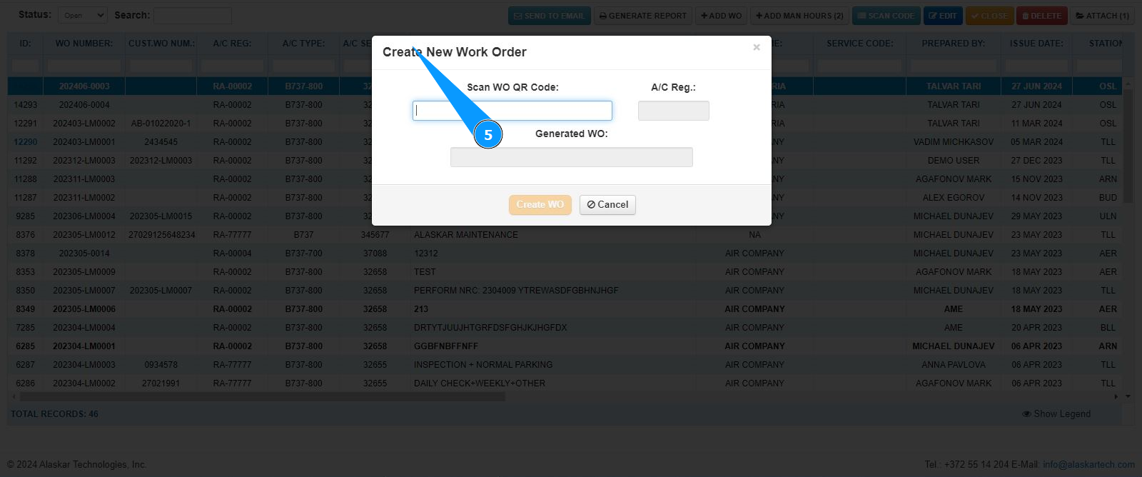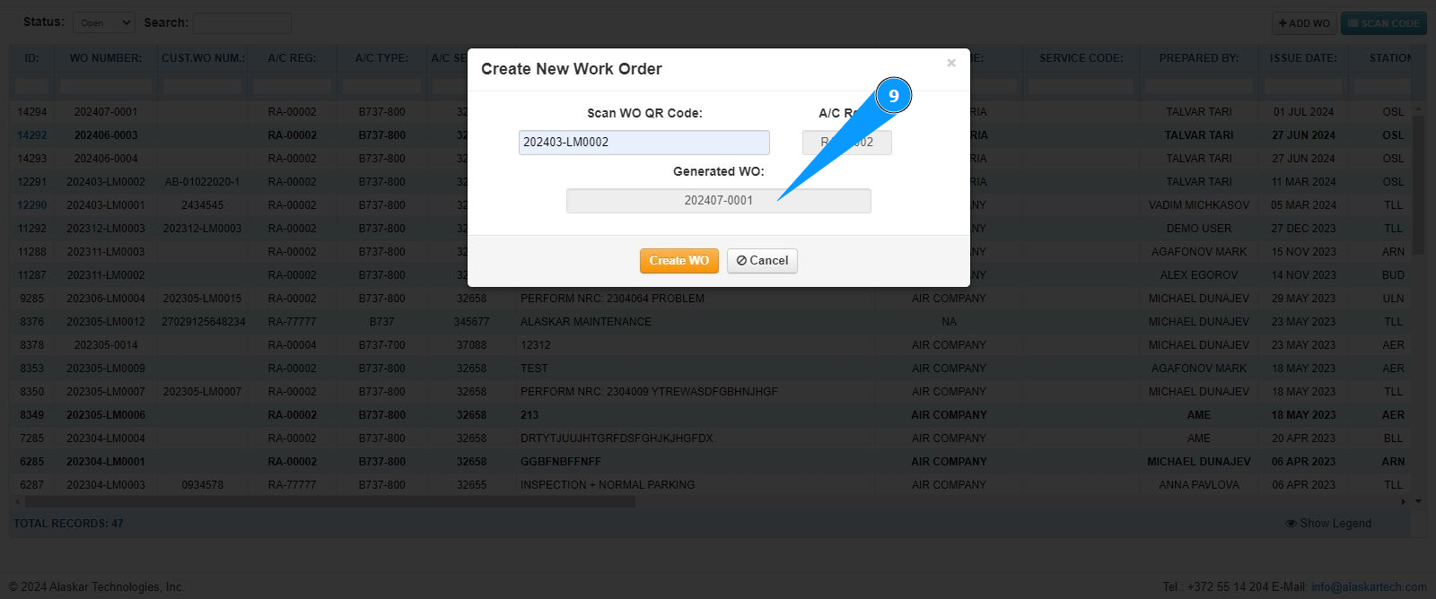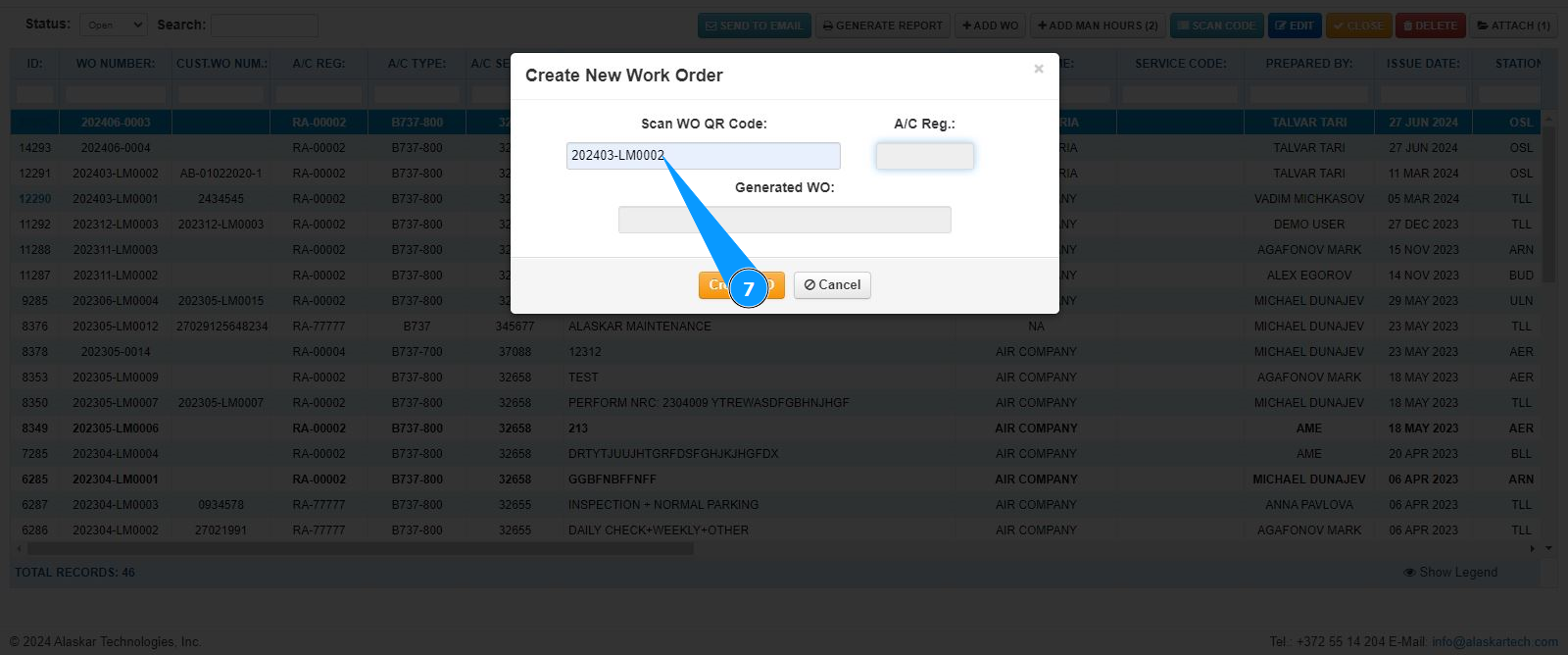 7. Make sure that the LWO number is displayed in the field "Scan WO QR Code".