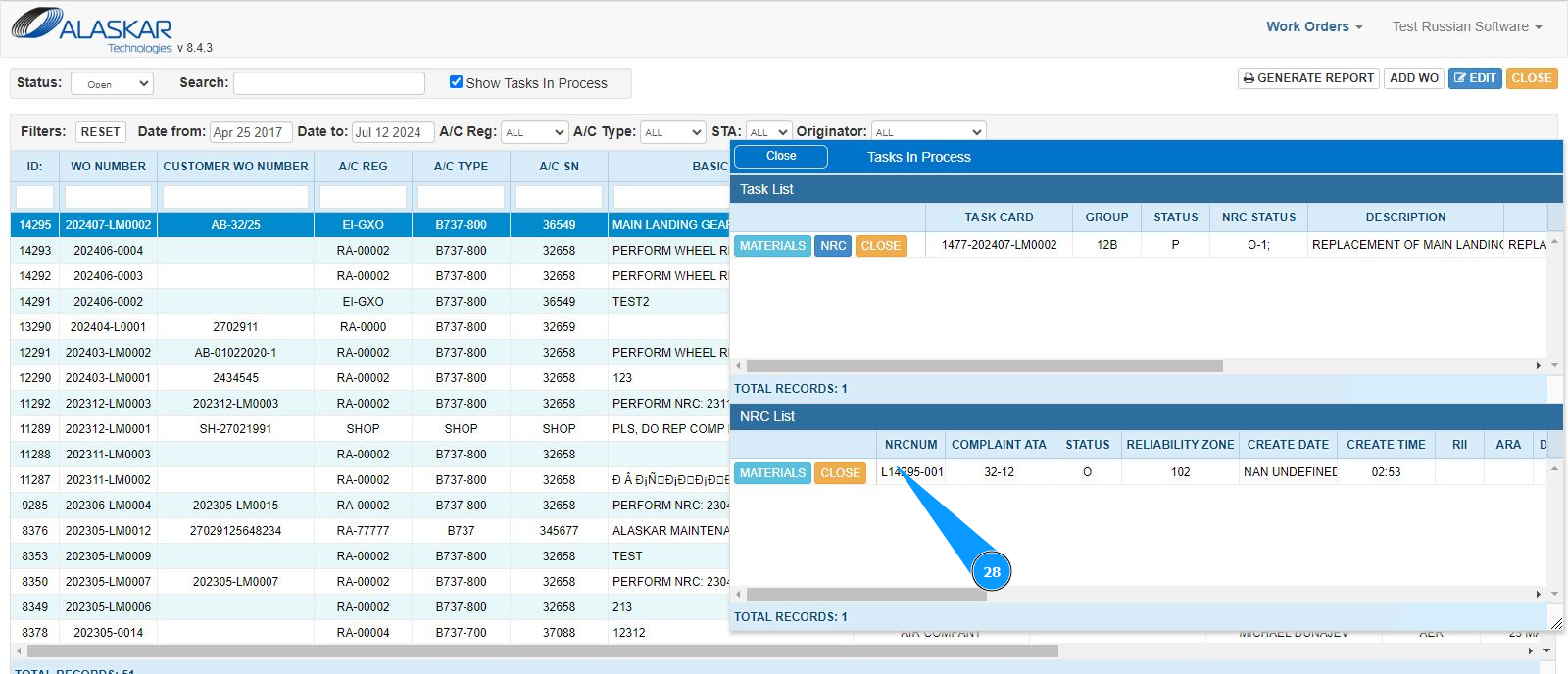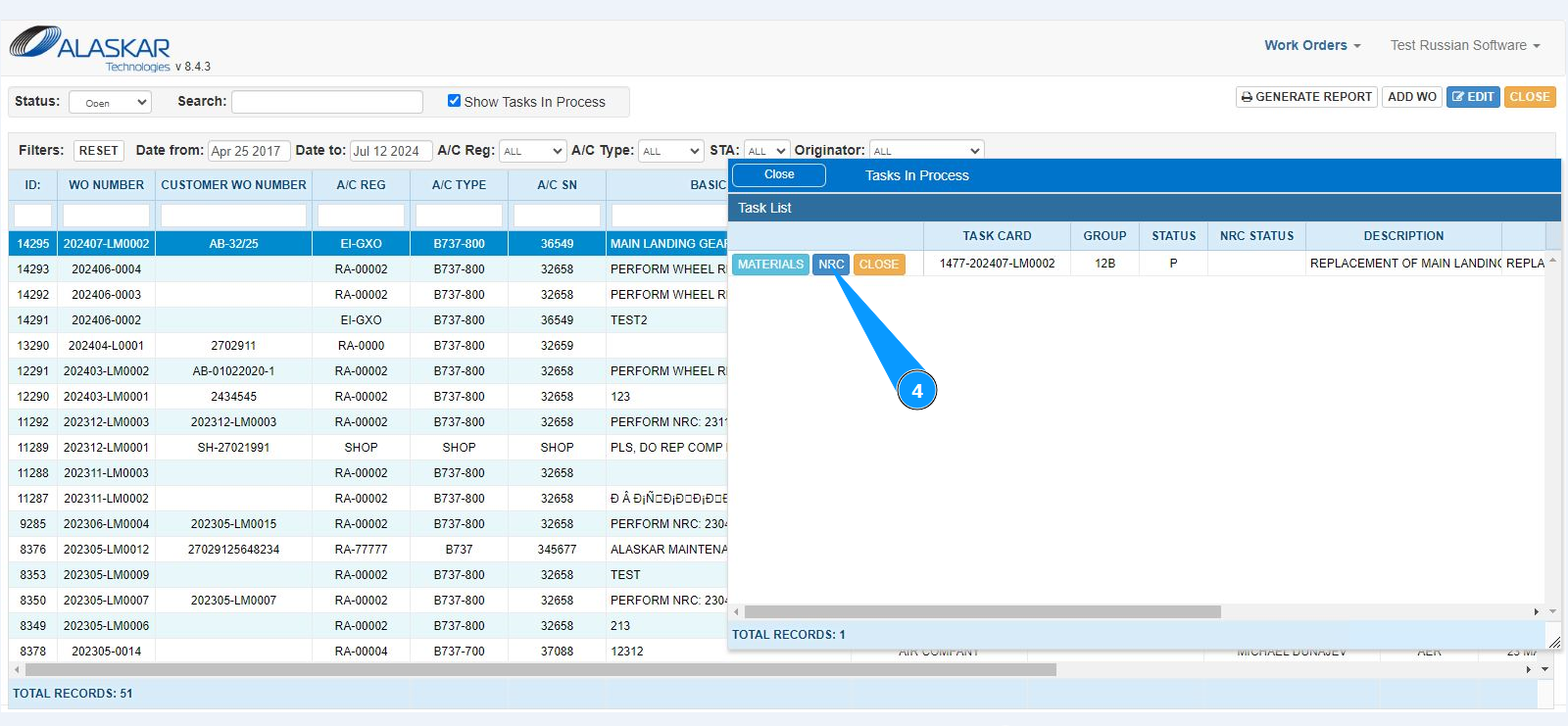 2. Select the required work order and click on the corresponding line. Note: If necessary, use the available filters in the fields: "A/C Reg.", "A/C Type", "STA" and so on.