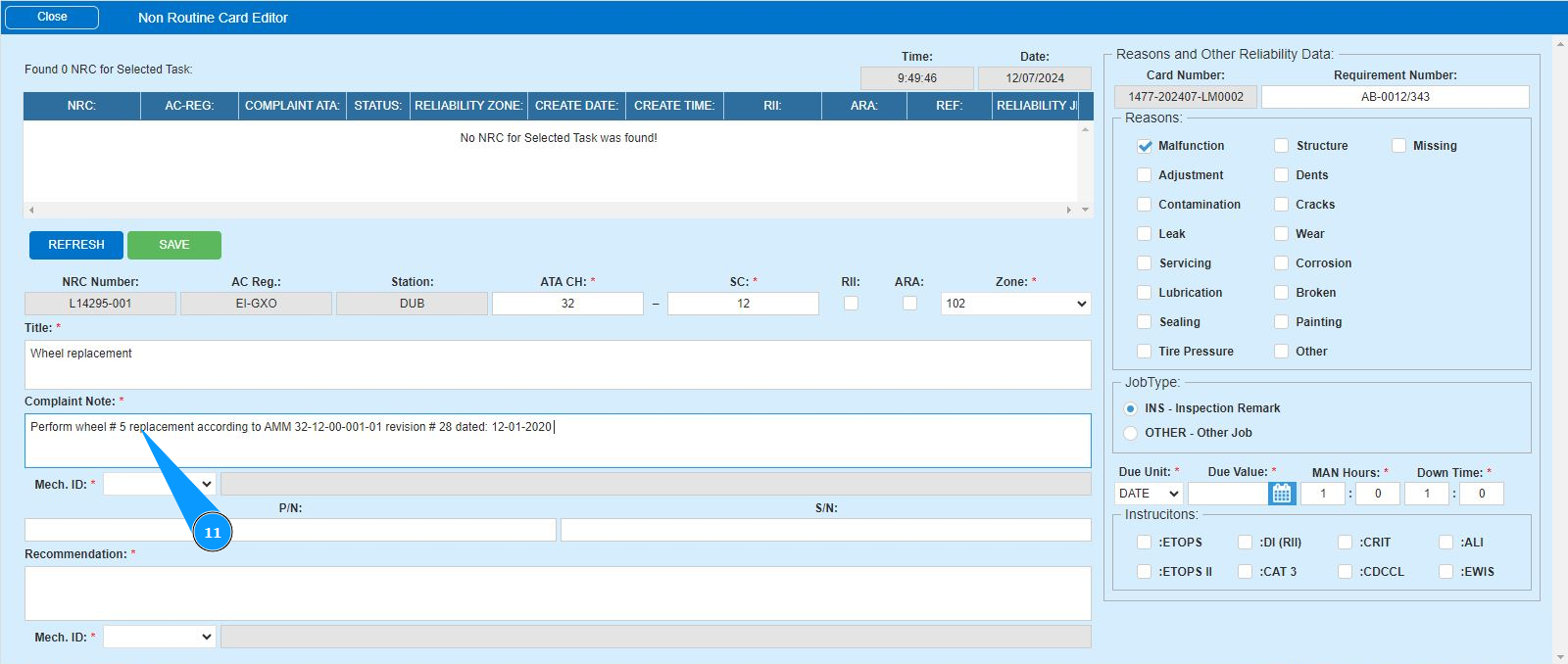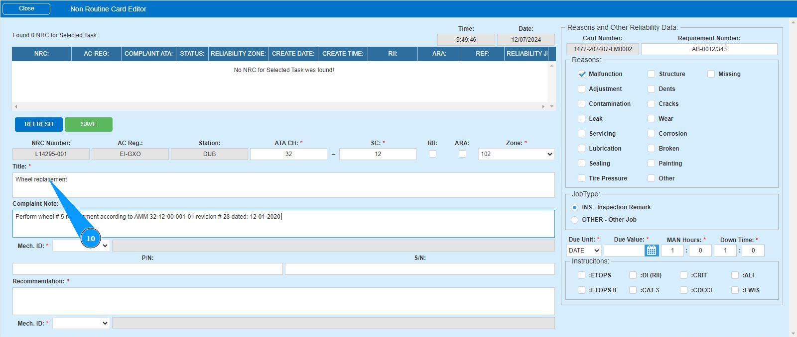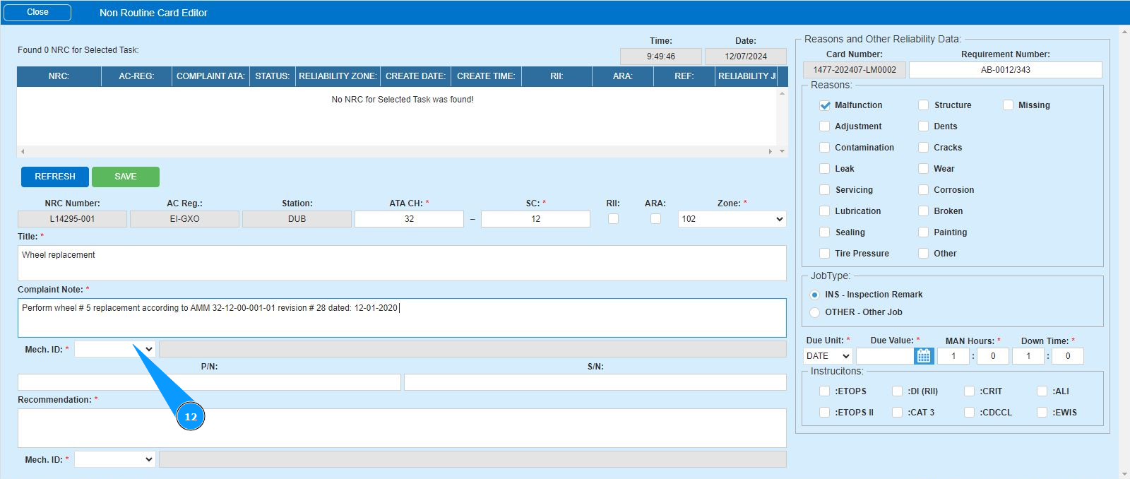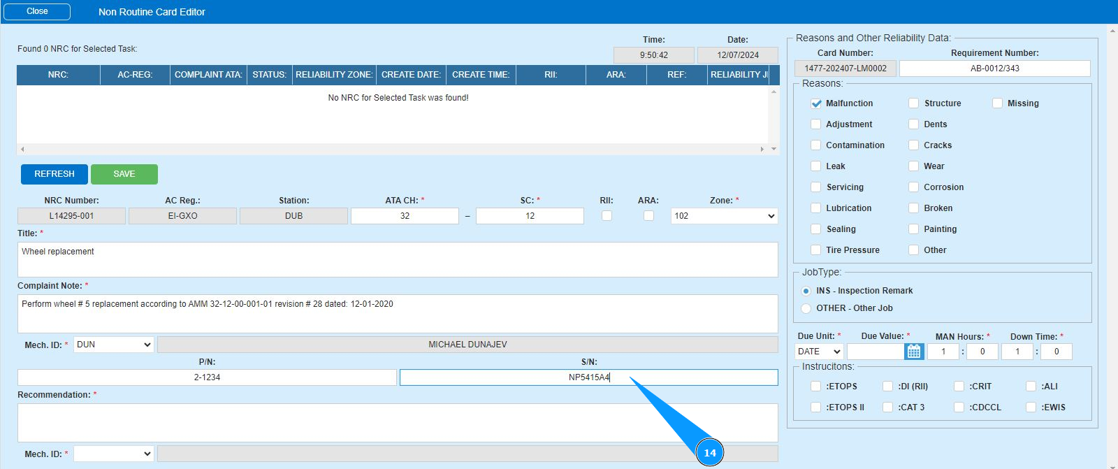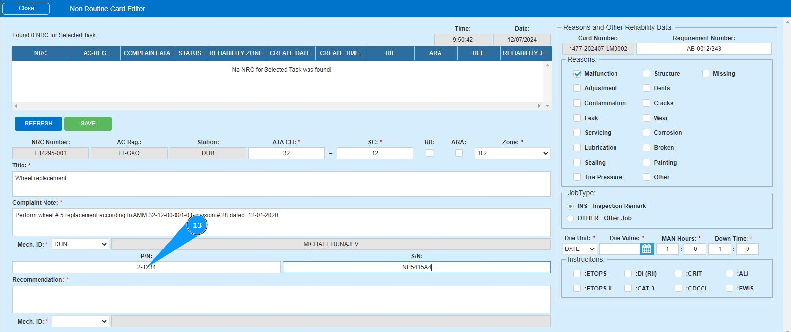 12. Enter the initials of the executor or creator of the NRC (in accordance with your company policy) in the field "Mech.ID" or select from the dropdown list. Note: The last and first names of the personnel are displayed automatically by the program.