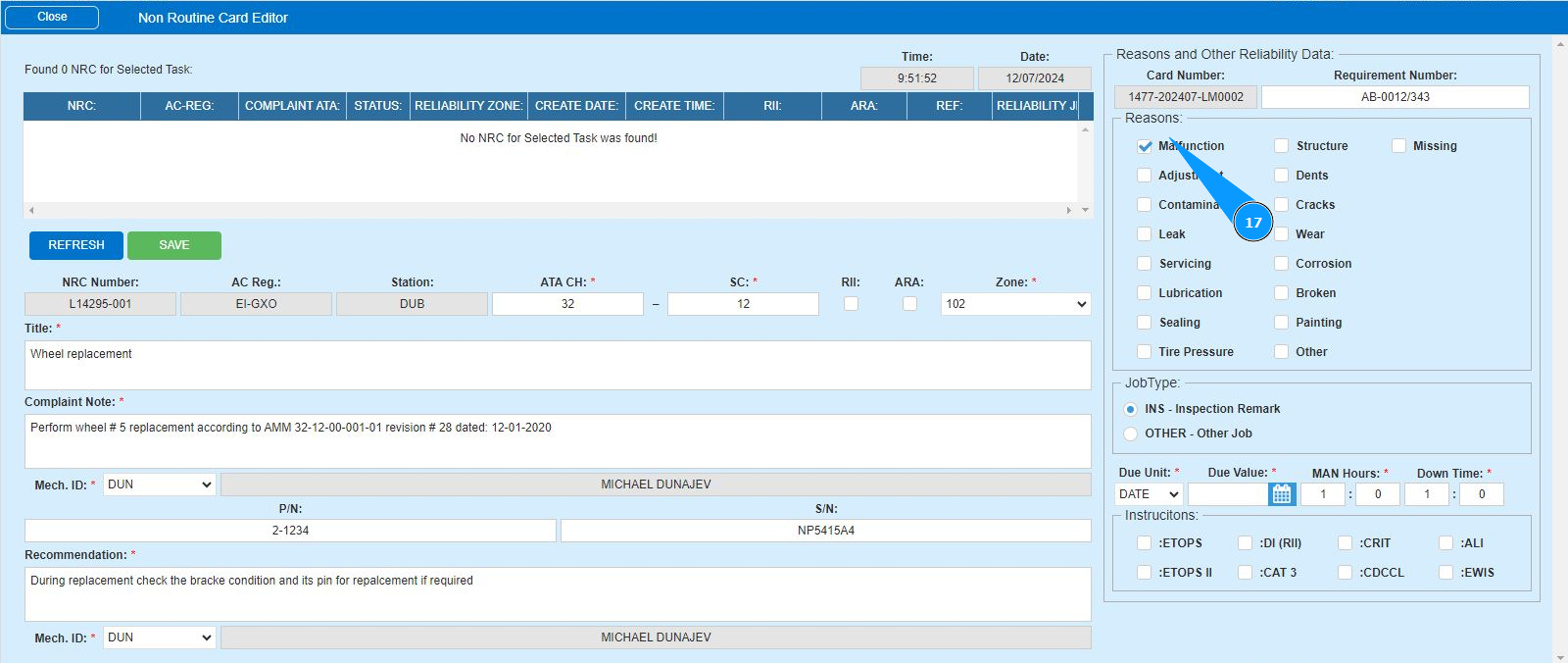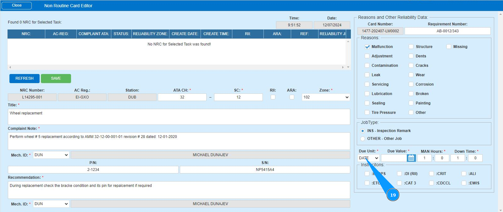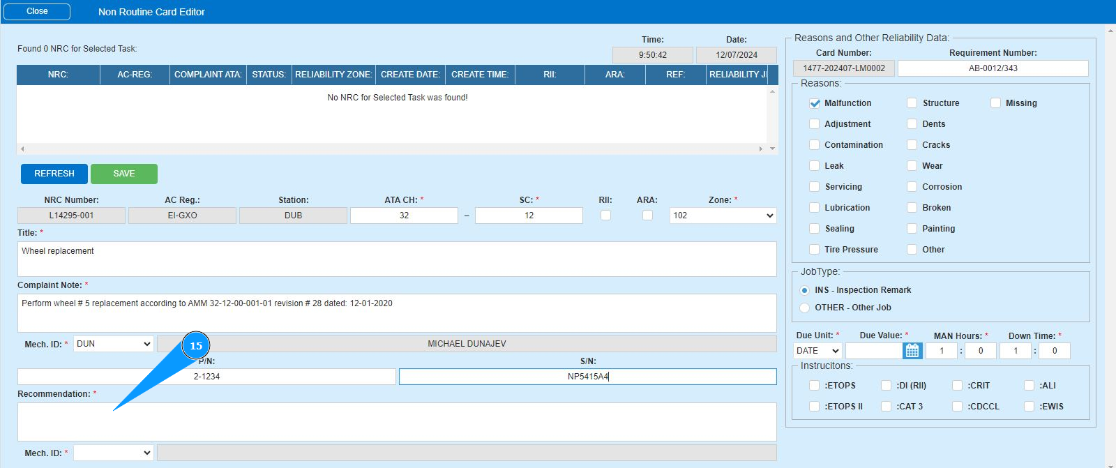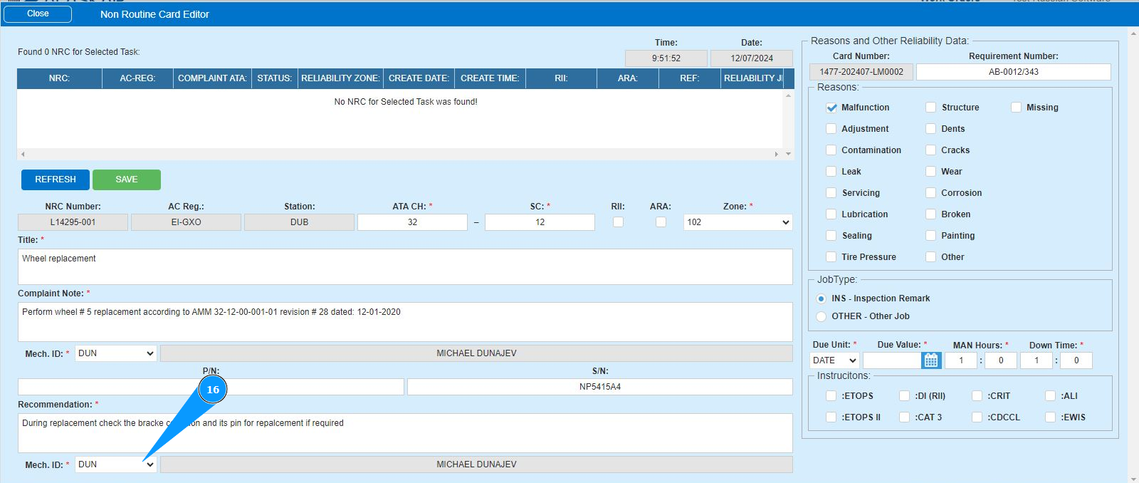 16. Enter the initials of the executor or creator of the NRC (in accordance with your company policy) in the field "Mech.ID" field or select from the dropdown list. Note: The last and first names of the personnel are displayed automatically by the program.