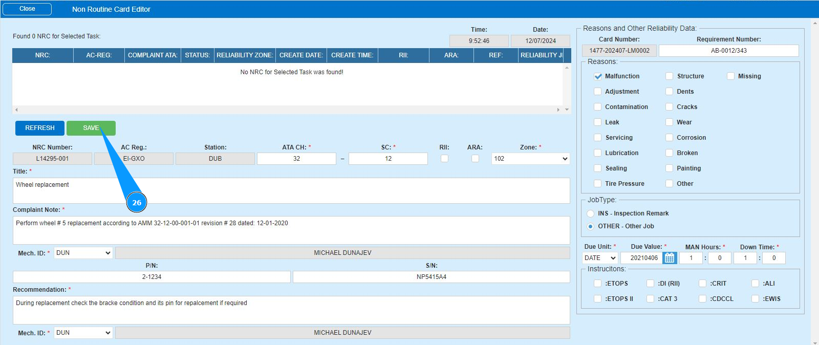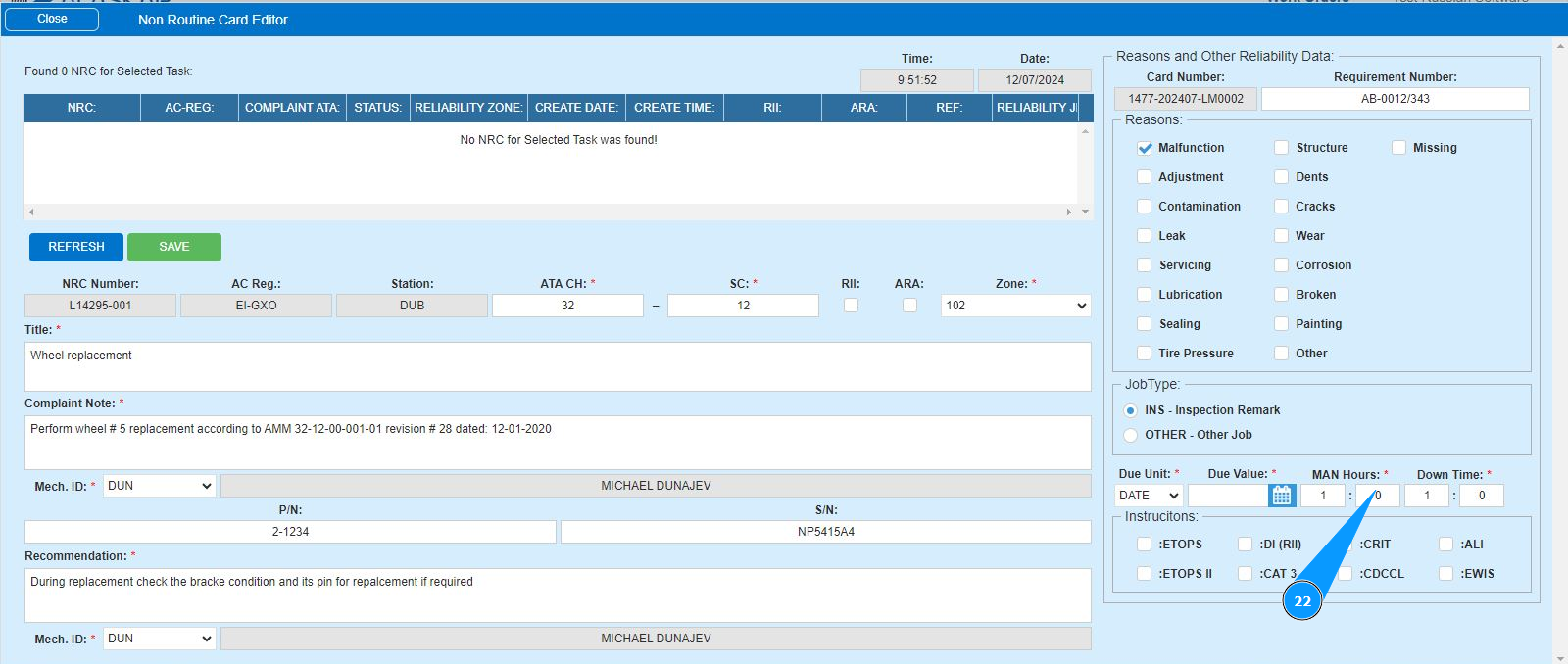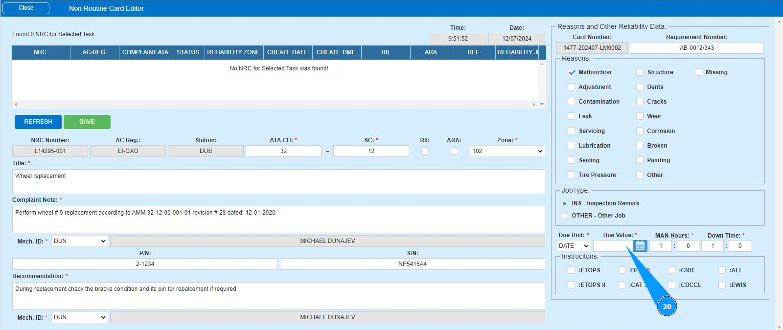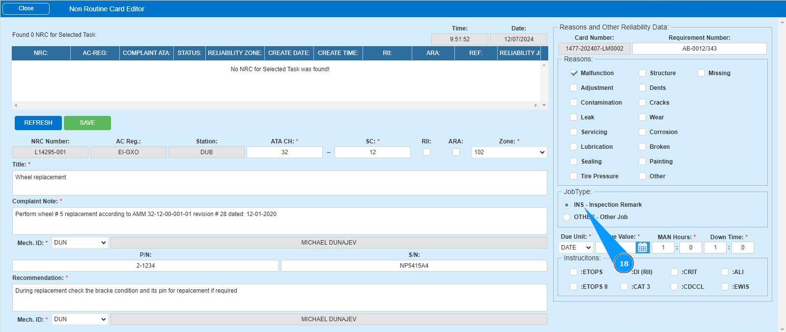 16. Enter the initials of the executor or creator of the NRC (in accordance with your company policy) in the field "Mech.ID" field or select from the dropdown list. Note: The last and first names of the personnel are displayed automatically by the program.