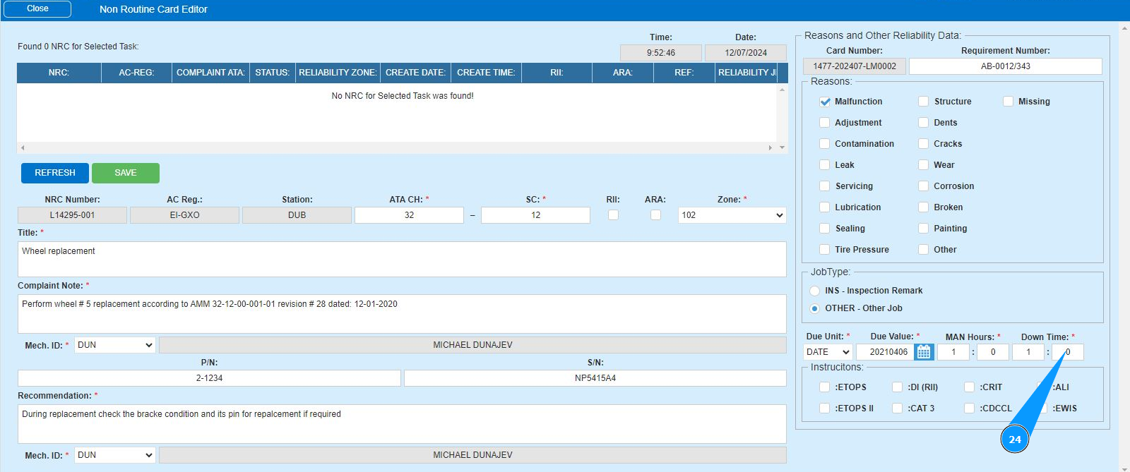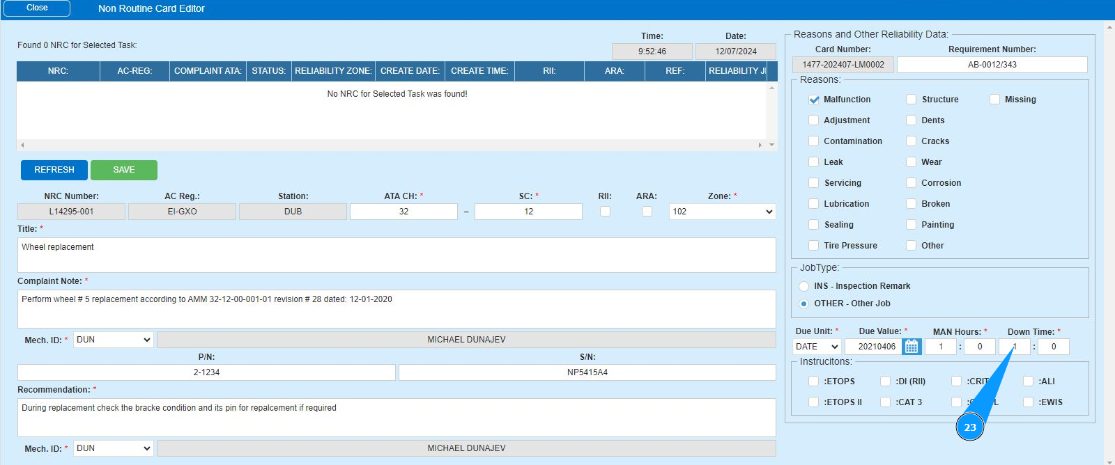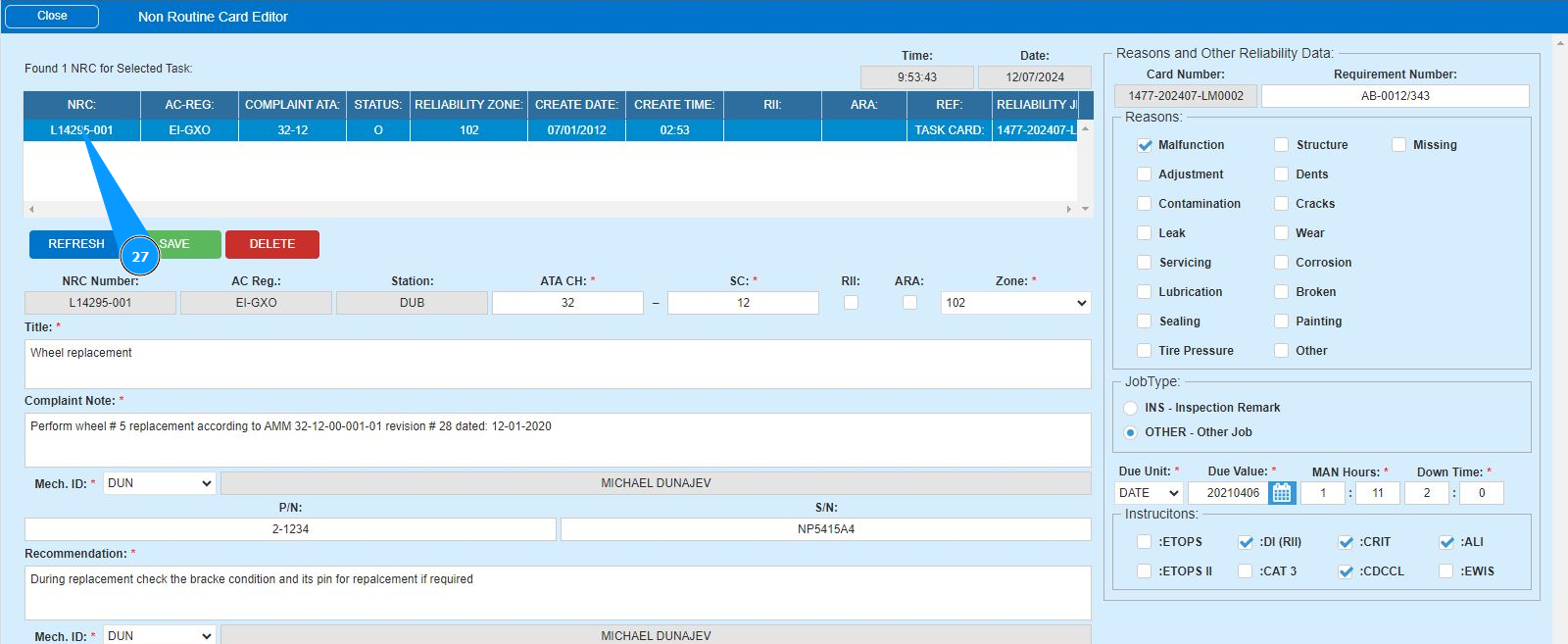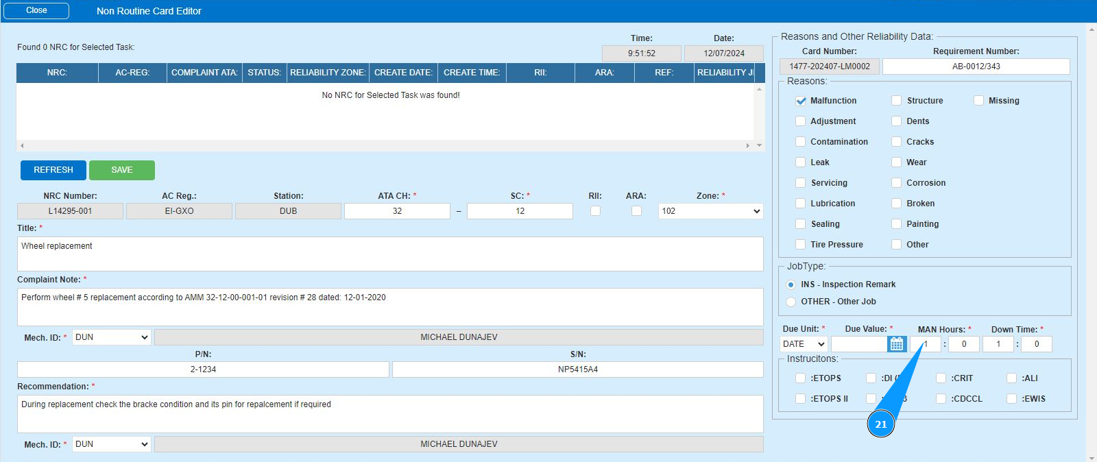 16. Enter the initials of the executor or creator of the NRC (in accordance with your company policy) in the field "Mech.ID" field or select from the dropdown list. Note: The last and first names of the personnel are displayed automatically by the program.