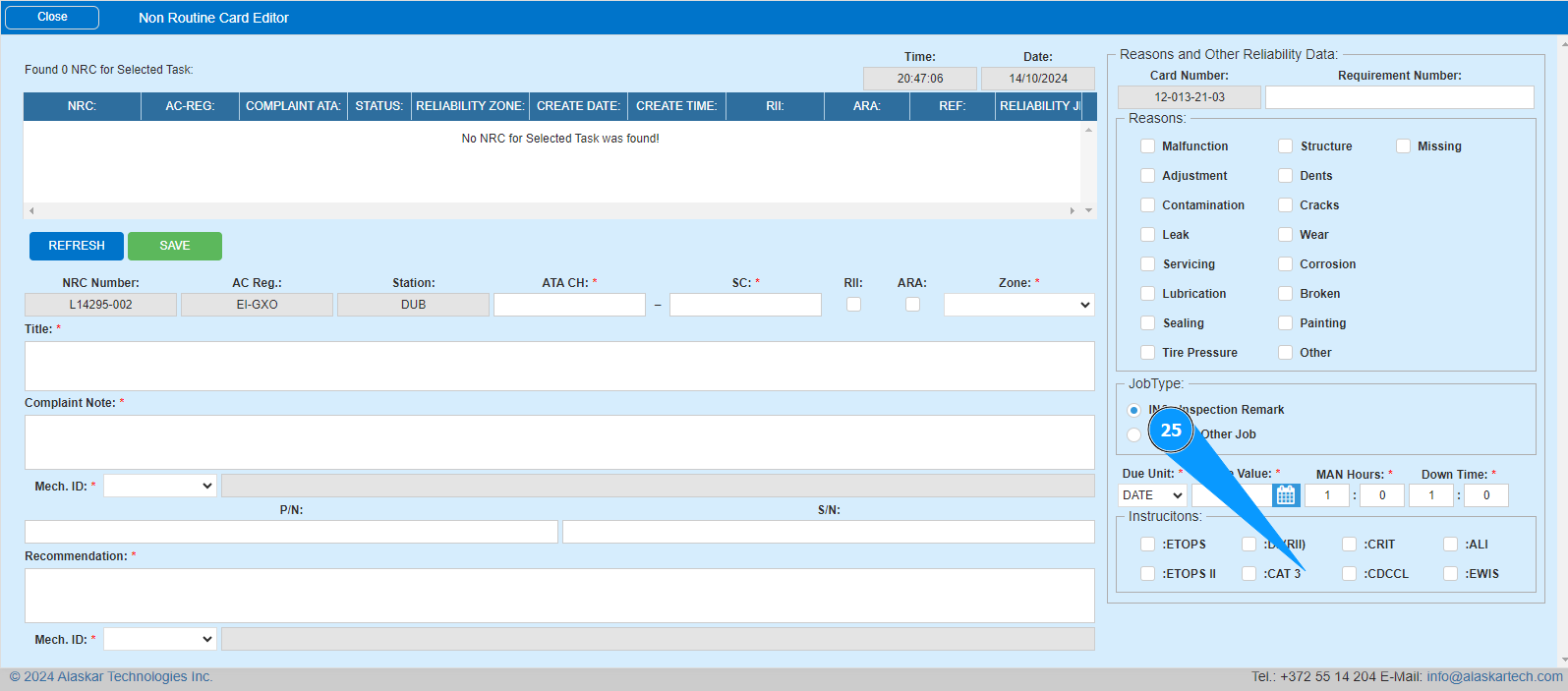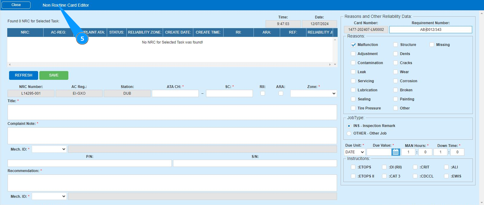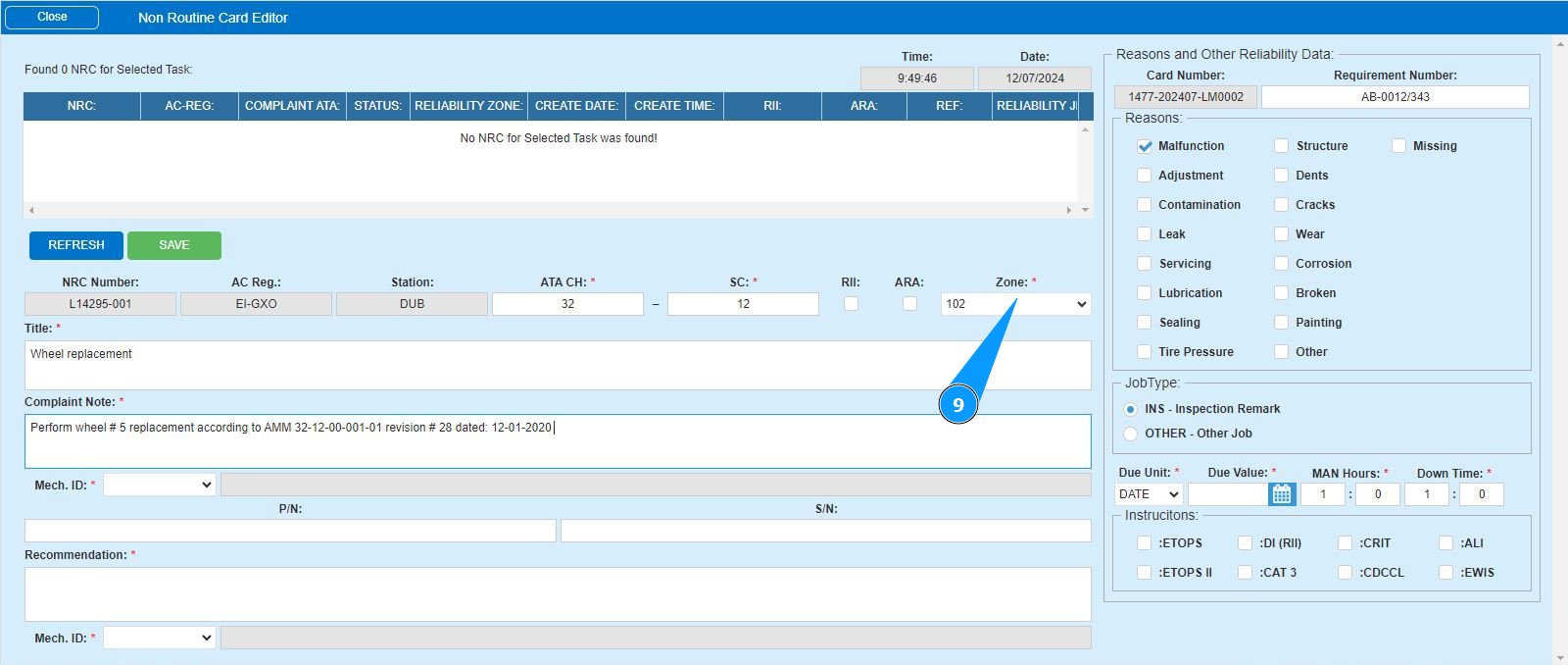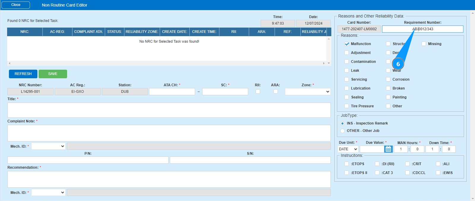 17. Enter the reason for creating the NRC in the field "Reasons" and click in the appropriate.