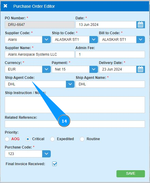 14. Select the delivery company code from the dropdown list in the field "Ship Agent Code. Note: The shipping company name will appear automatically in the field "Ship Agent Name".