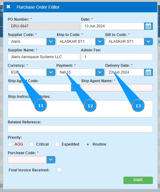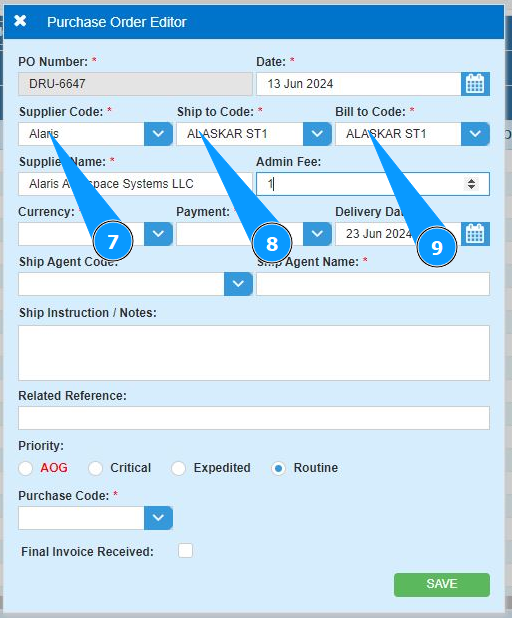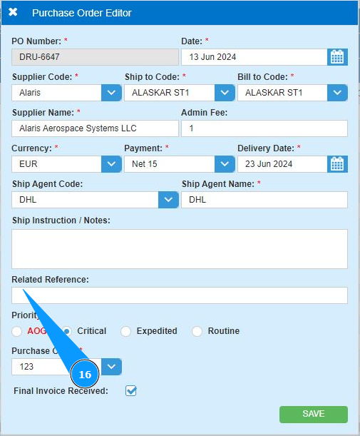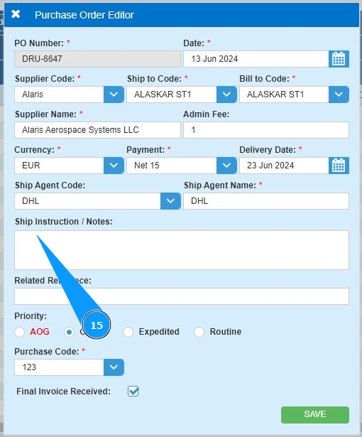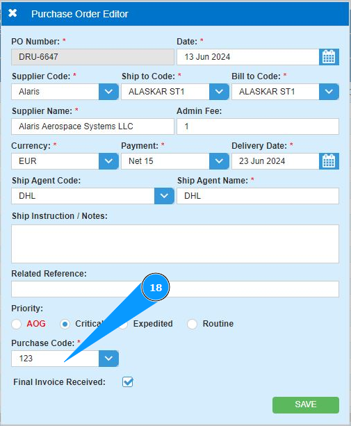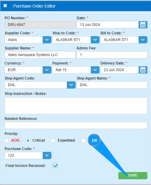 19. Click on the button "Save" to add the PO data to the program.