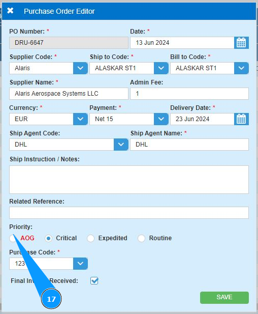 17. If the aircraft is on the ground and departure is impossible, click in the field "AOG" or set other priorities by time.