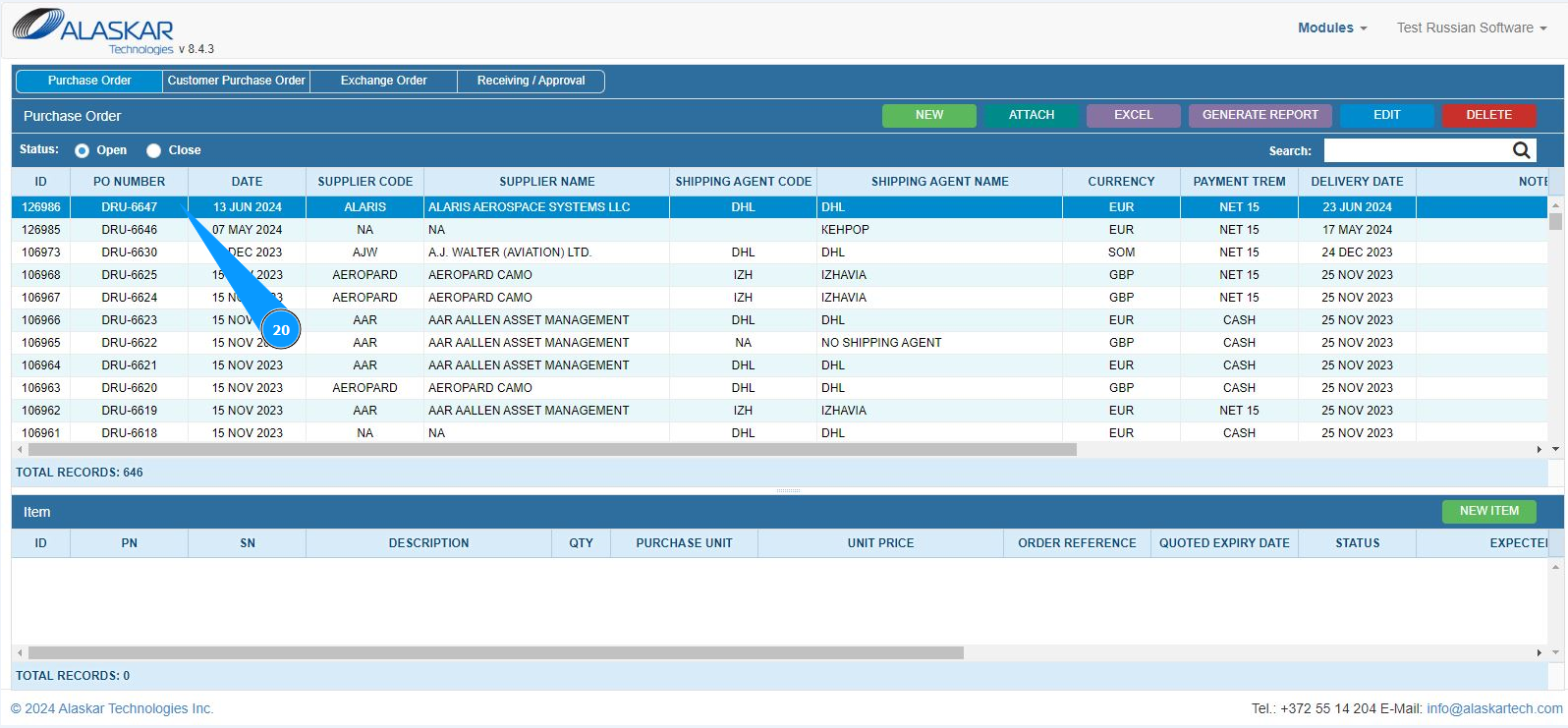 20. Check that the newly created PO is displayed in the window "Purchase order".