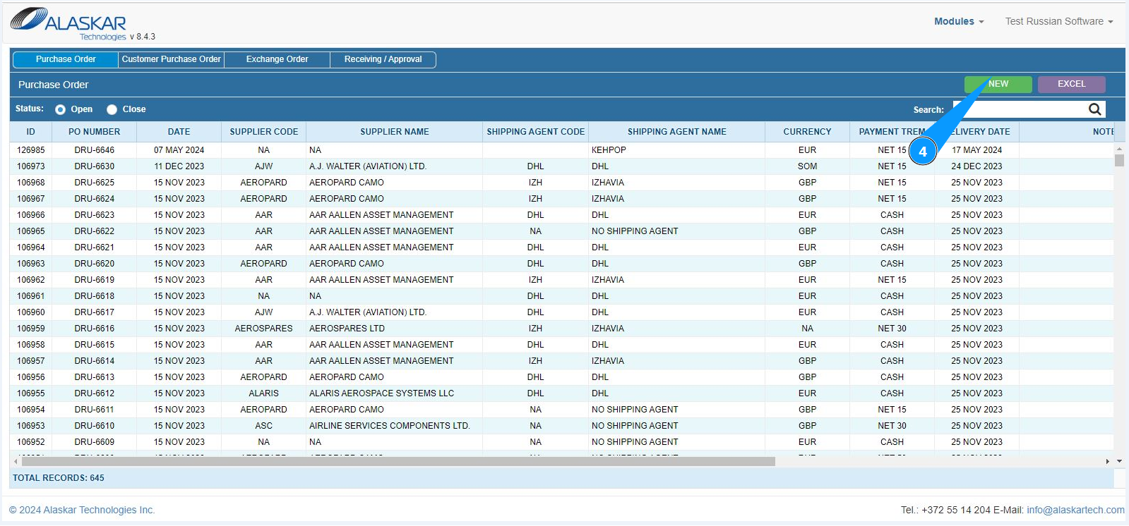 4. Click on the button "New" to open the PO editor.