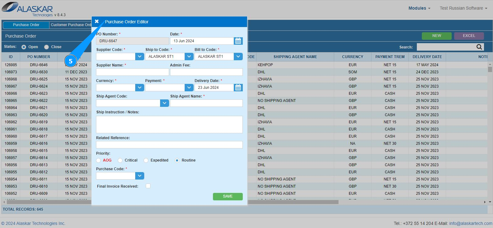 5. Make sure that the PO creation editor is open and accessible in the window "PO Editor". Note: The PO number will be entered automatically by the program in the field "PO Number".