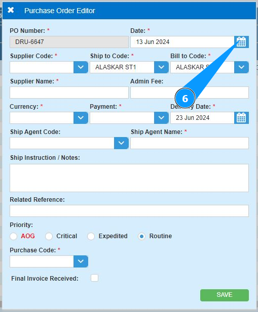 6. Enter the date the PO was created in the field "Date" or select from the calendar.