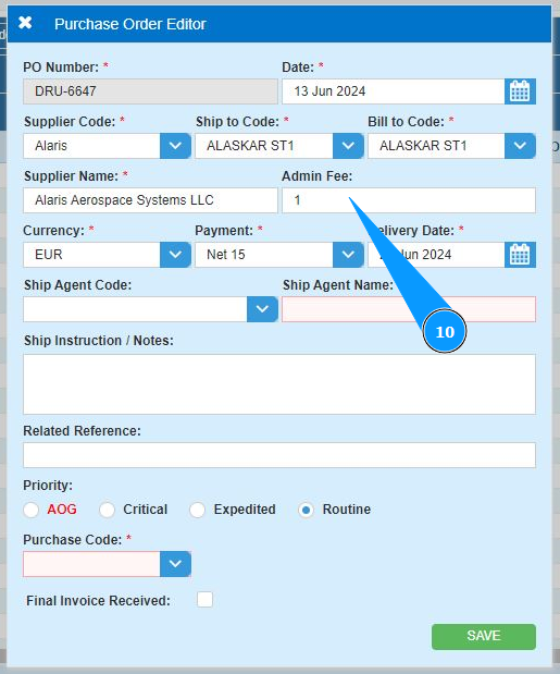 10. If necessary, enter the supplier's coefficient in the field: "Admin Fee".