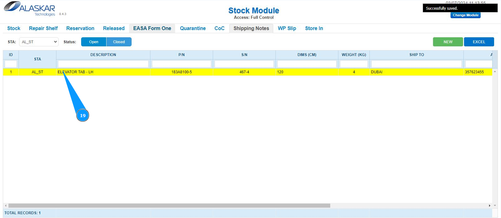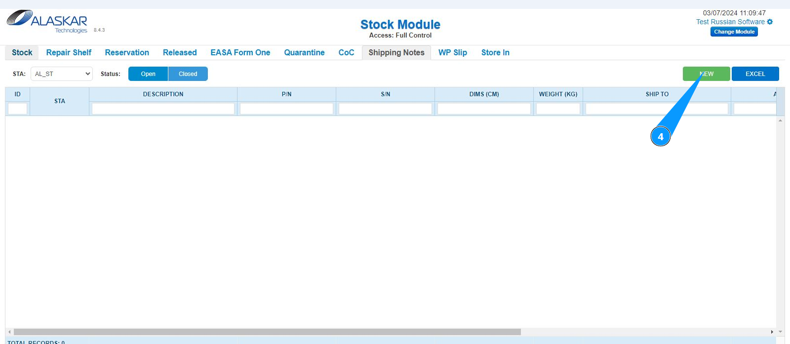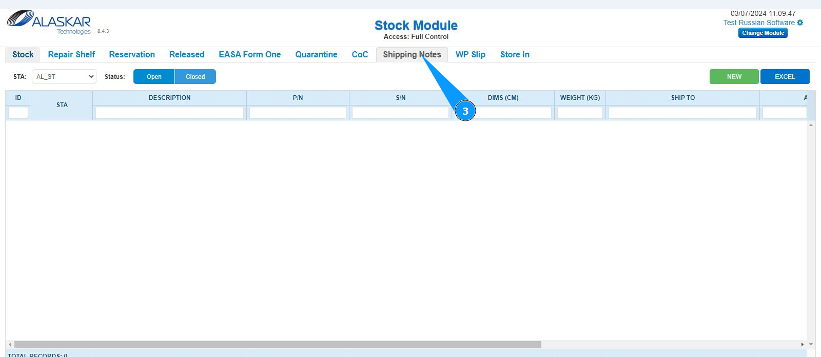 1. In order to enter details for shipping a component, go to the submodule "Stock".