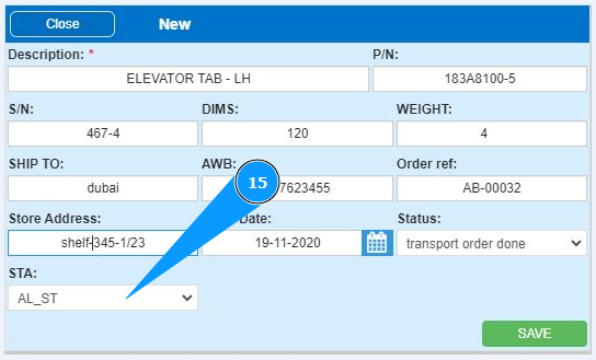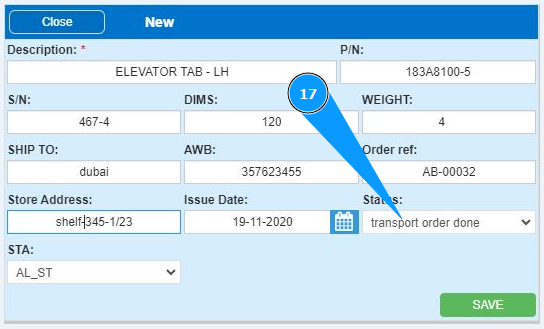 17. Select the component's shipping status from the dropdown list in the field "Status".