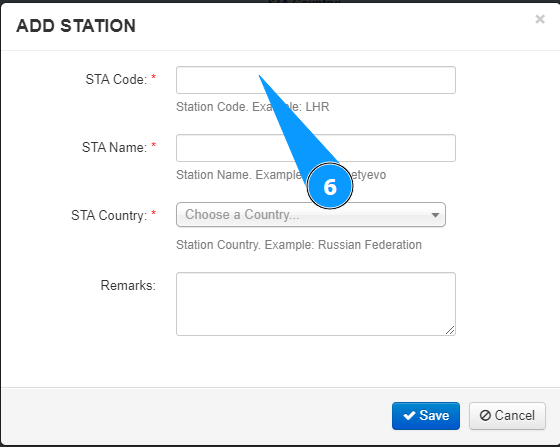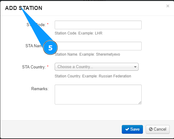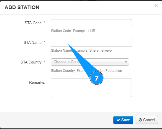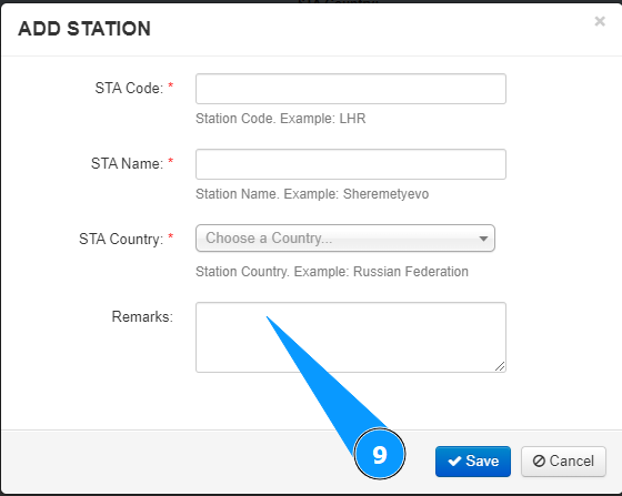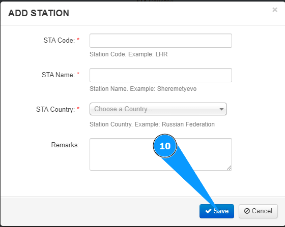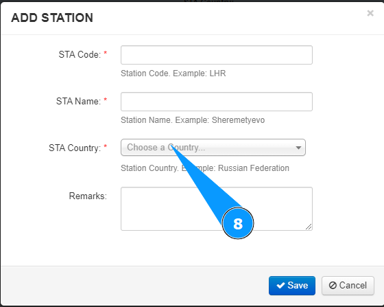 8. Select from the dropdown list the name of the country where the line station is located in the field "STA Country" .