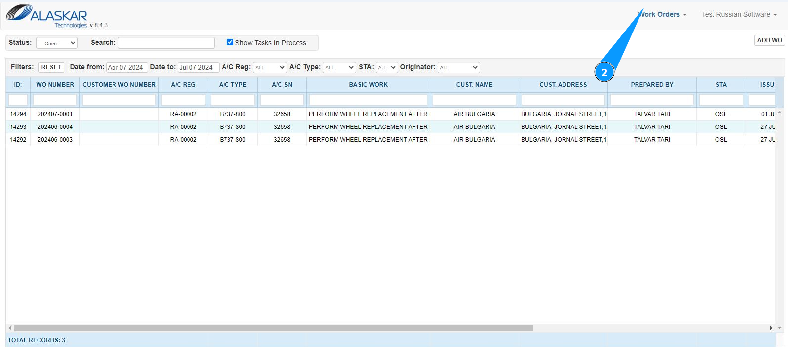 2. Make sure that the window for working with WO is open and accessible in the window "Work Orders".