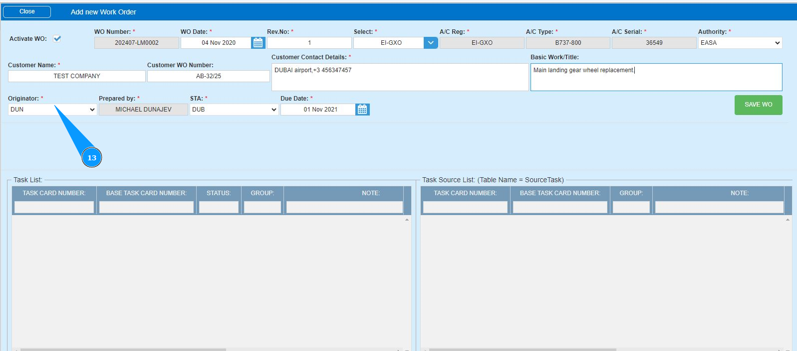 13. Select the specialist who opened the WO from the dropdown list in the field "Originator". Note: The field with the specialist's first and last name "Prepared by" will be filled in automatically by the program.