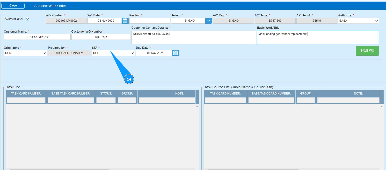 14. Select from the dropdown list the location where the WO work will be performed in the field "STA".