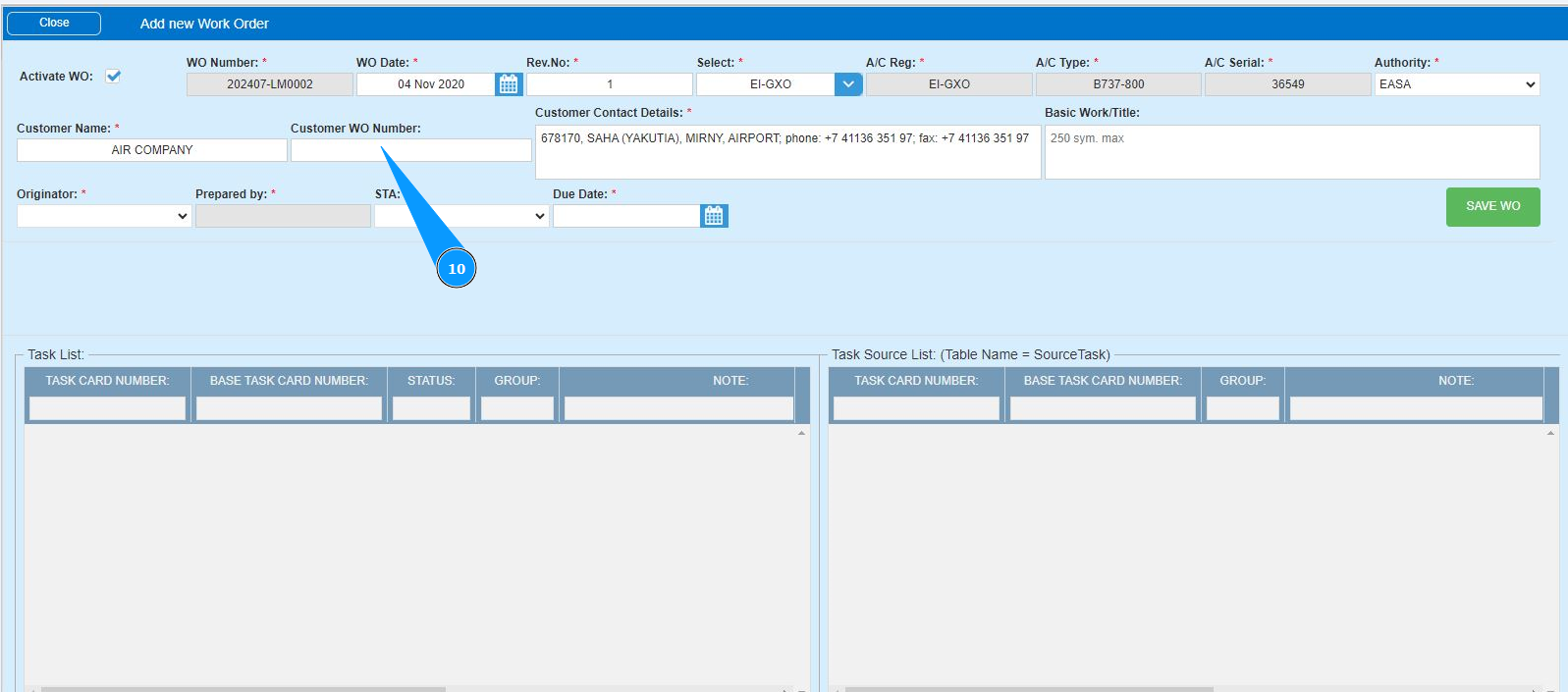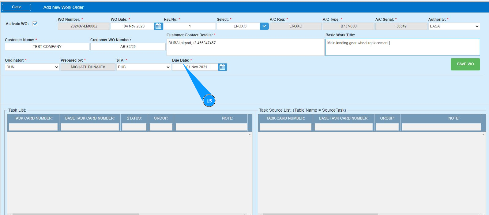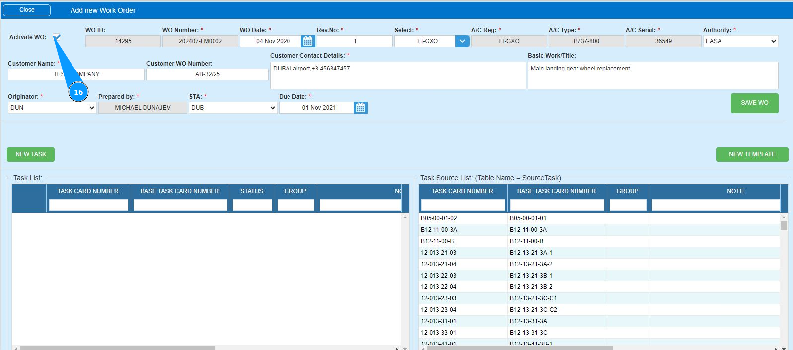 16. Make sure that the WO active state checkbox is ticked in the field "Active WO".